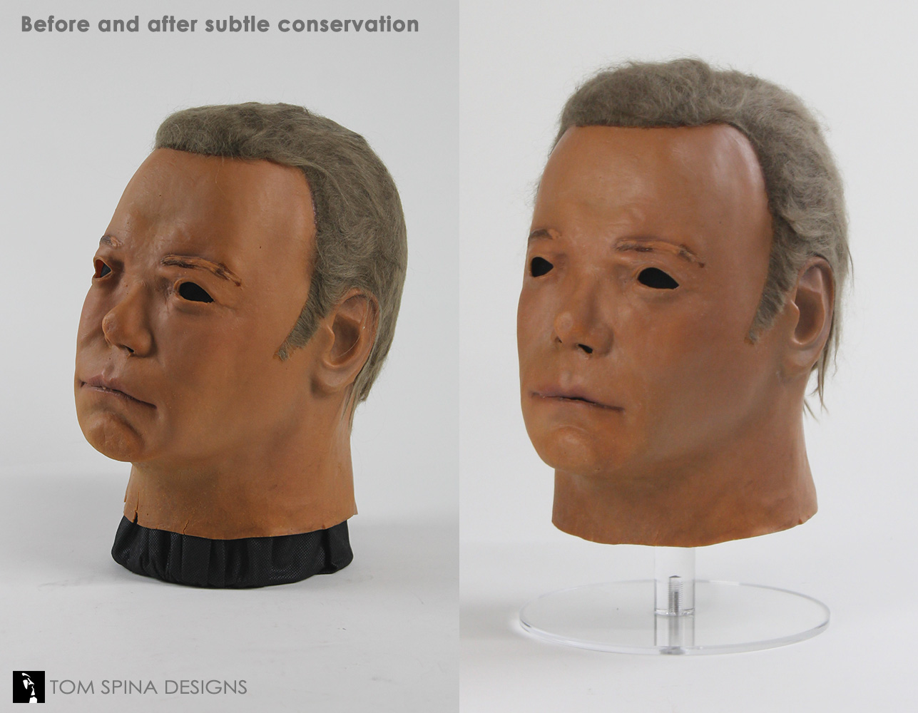 One of the most prolific finishing artists in the hobby believes the Kirks were haired with a brown color and not blonde. I don’t believe that to be true. I think the masks were handled and touched up so frequently during shooting, by the actors, stylists, TLW, etc., that the original blonde hair took on a brown color beneath the black mist.