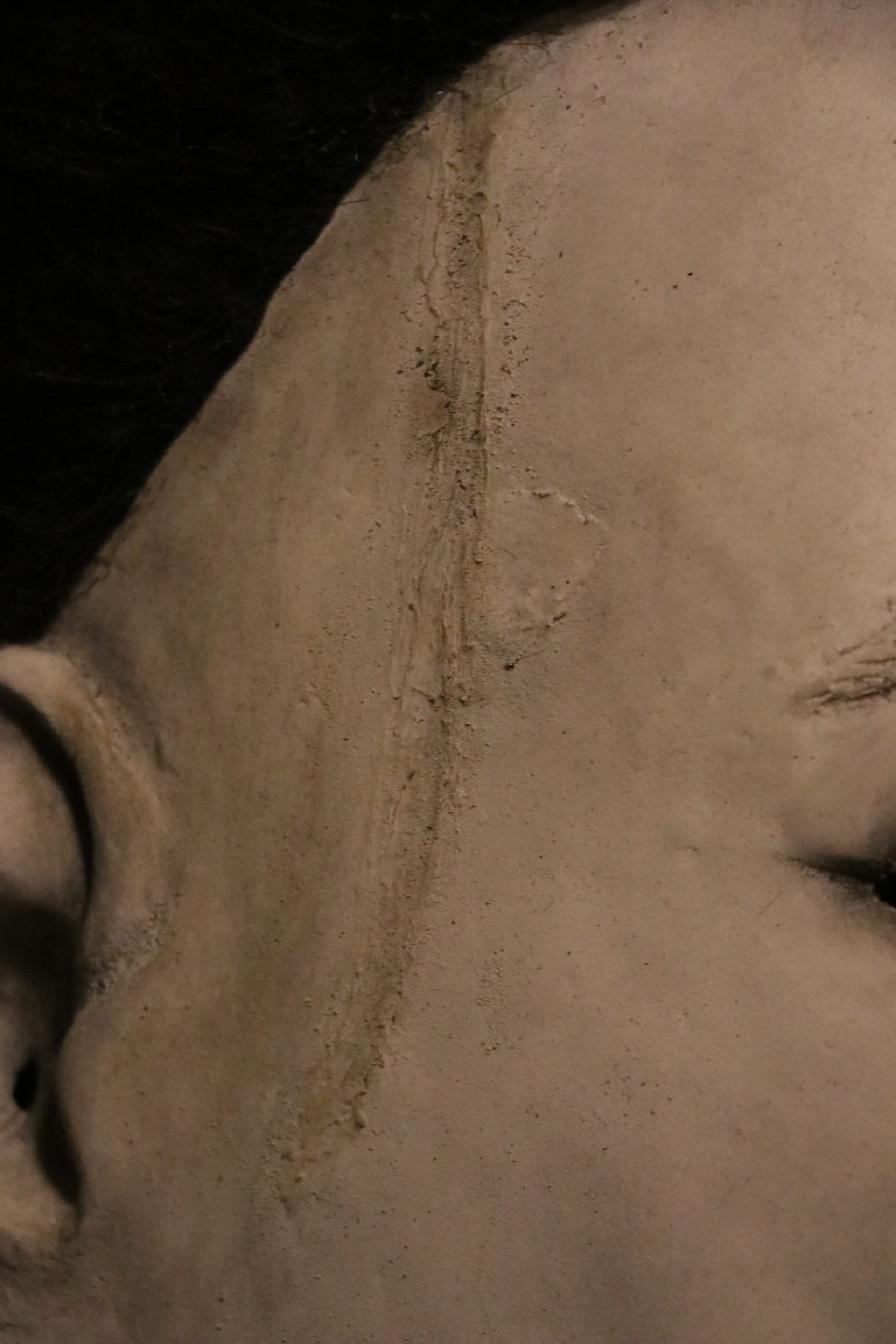 Here it is after some more shading/hair styling. I brought [the masks] left eye in a bit further with my dremel, which worked well, and also brought out the glue lines with some latex. After removing them a bunch due to experimenting, I eventually lifted what I think is a wash layer, and it started to peel. I smoothed it with some latex and painted over it, which is unfortunate that it happened but I’m alright with it. I might do some more weathering around the lines, but take a look for now!