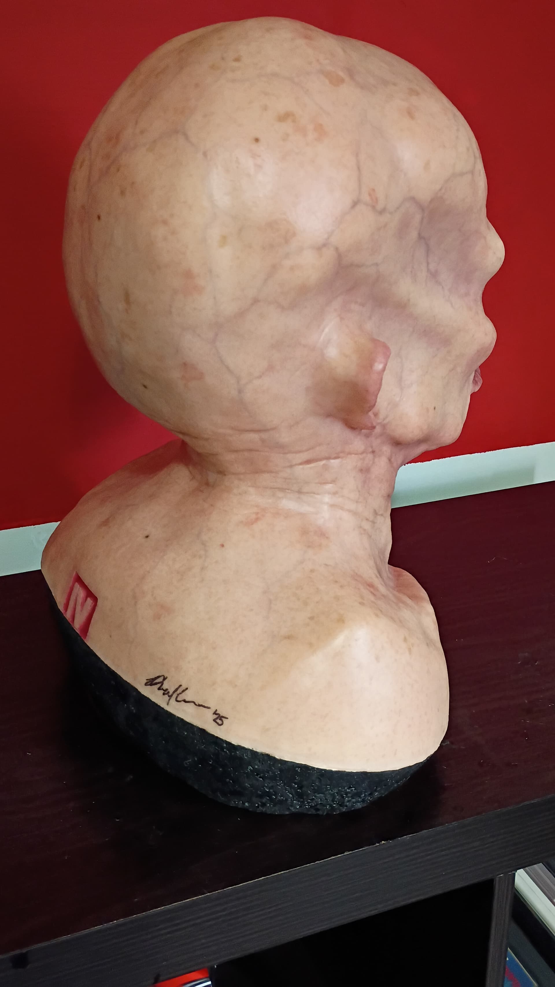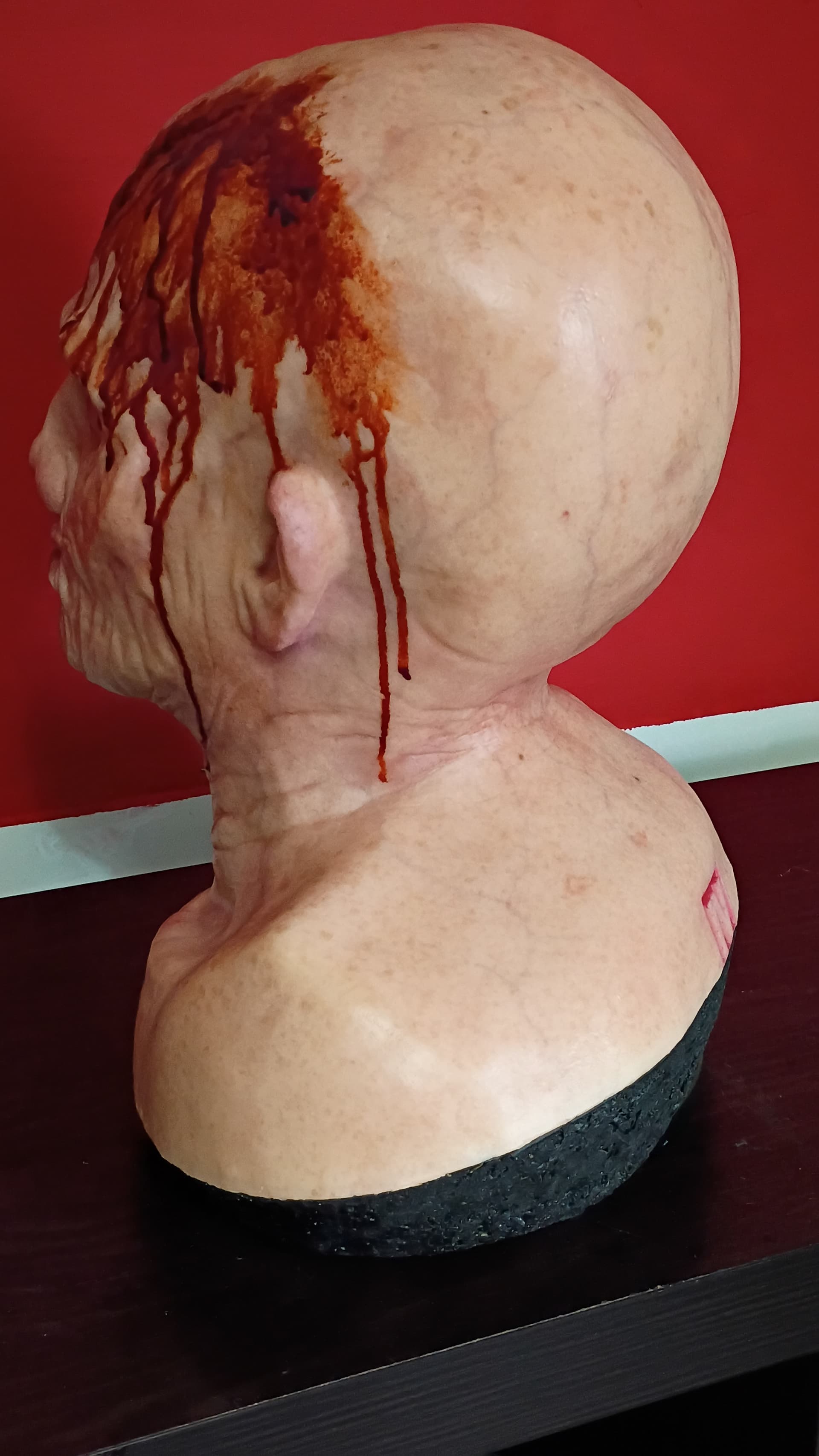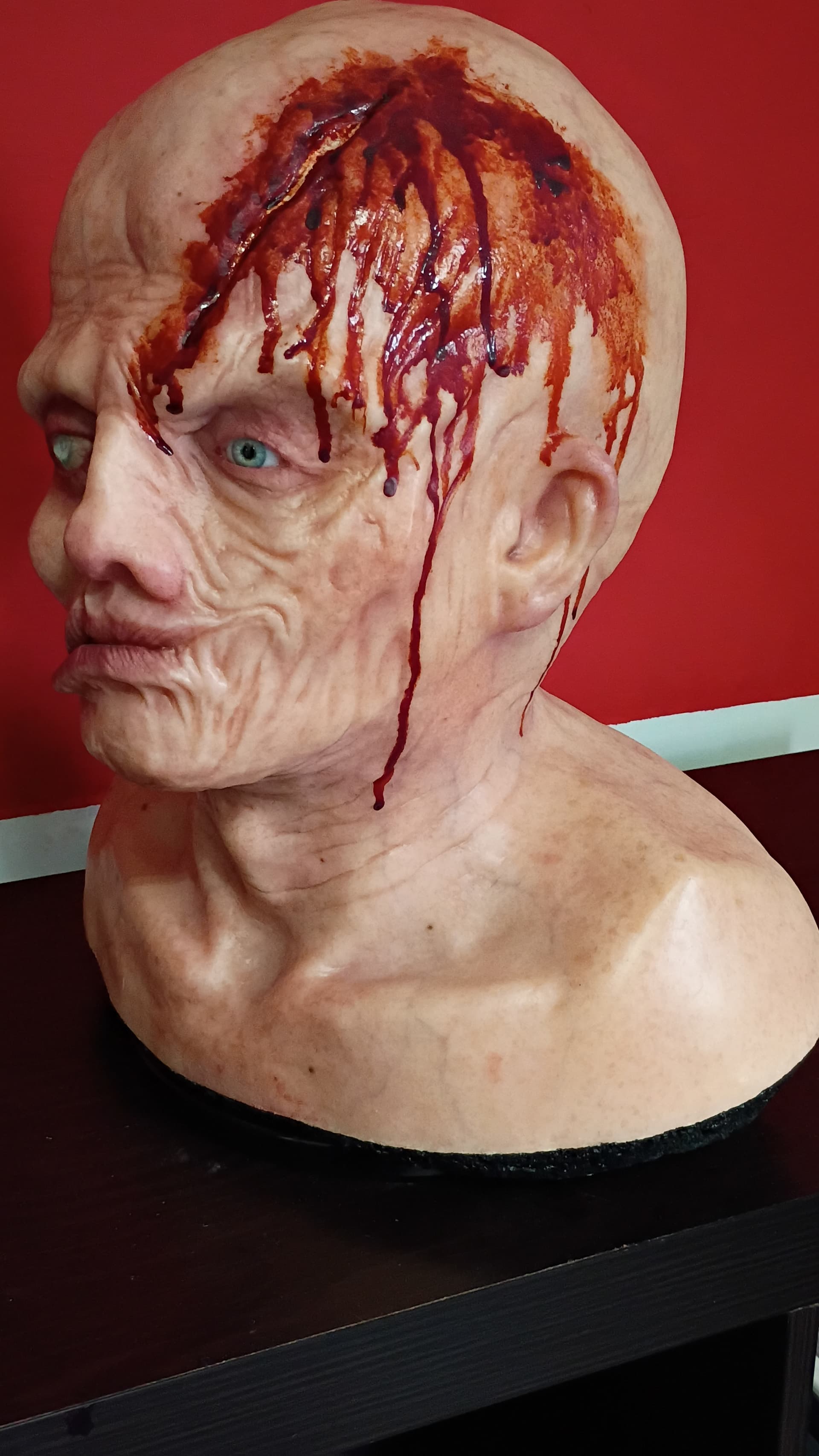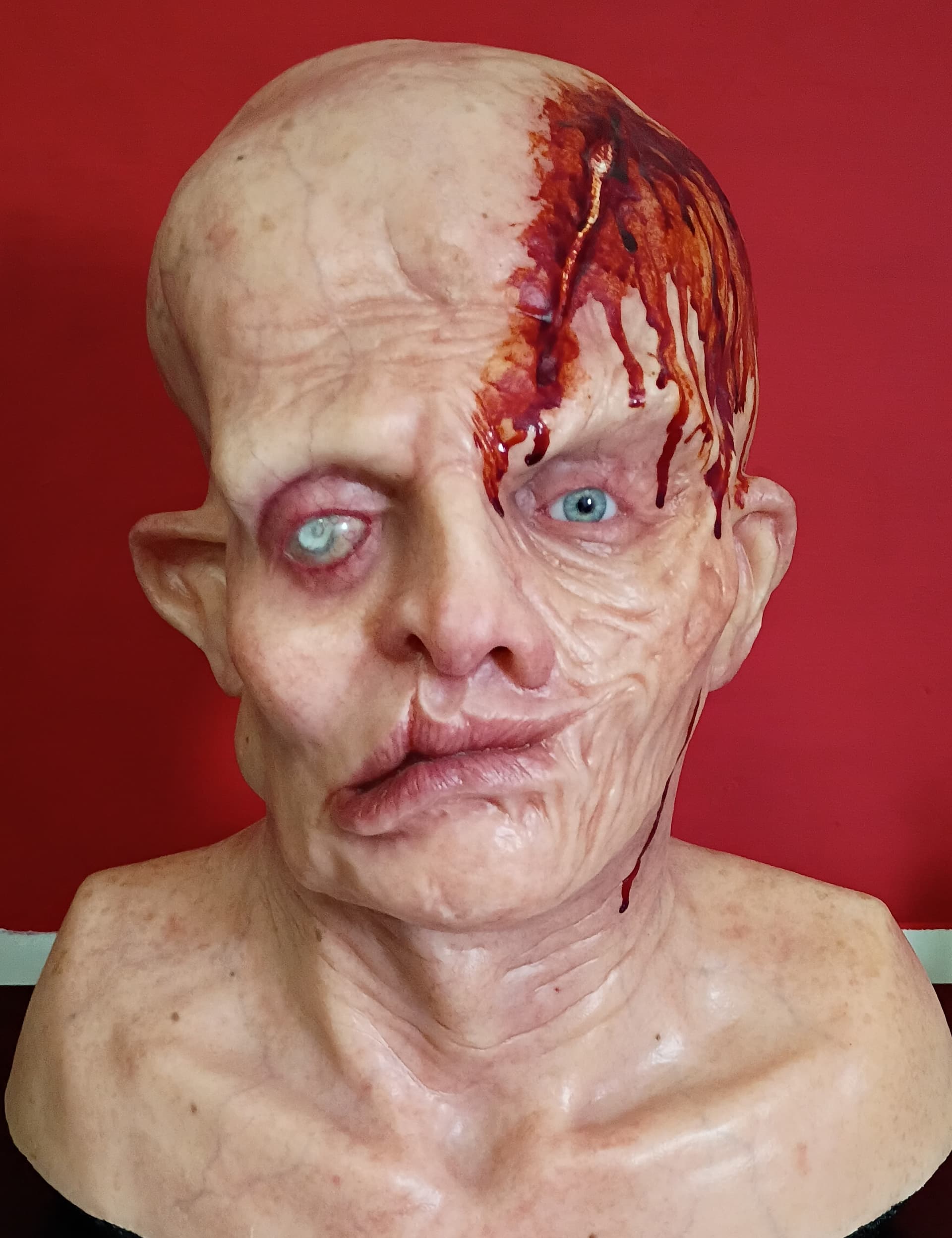 Translucent resin Life Size Jason Ted White Replica Bust. Extremely realistic in your hands. Movie set film level quality. Crazy realistic vein detail. Fourth seal eyes. Foamed solid. Painted by super talented Movie creature and makeup artist Reed Cesare. The blank was from Run 2 #2 . Probably the best paint work I’ve seen. I’ve had every Part 4 bust available. This is by far the best. Signed by Reed on backside.