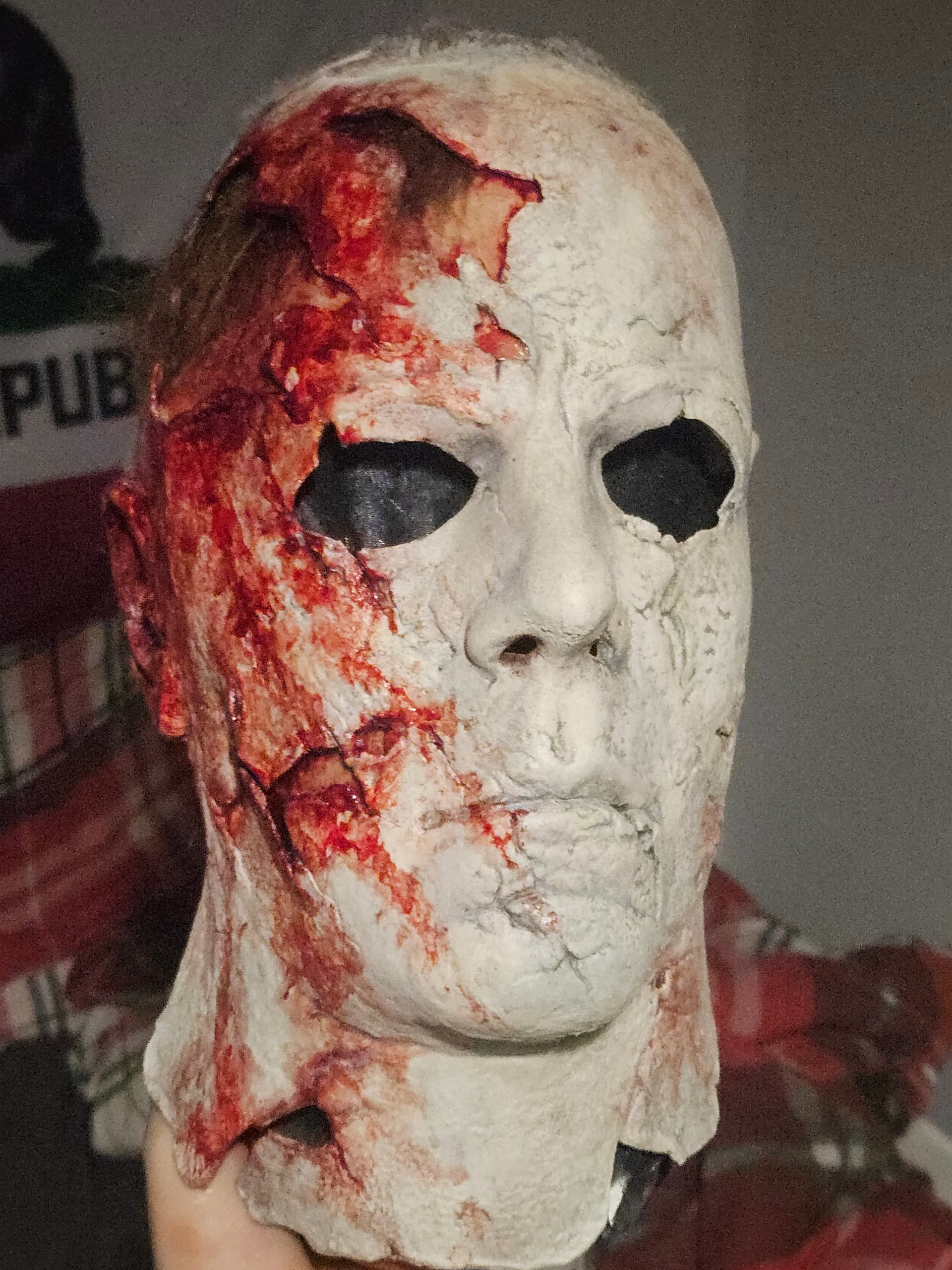 Been working on this bad boy today. Last night I thought it was a lost cause and considered just throwing it into my closet for the rest of eternity, but I woke up this morning and decided I’d give it another go. Needless to say, I’m glad I did, lol. Very pleased with it, and working on the blood was fun. However I thought that it looked a bit ridiculous with all this blood on the mask yet seeing my clean skin underneath, so I decided to make a skin insert out of an old ToTS H8 I had lying around that I didn’t care too much about. I cut pieces off and was going to paint the outside a flesh color, but I realized I could just use this inside. Covered it in blood, added some strands of mohair, then stuck it in, and got in my opinion a fantastic result. Very happy with this mask! Thanks for taking a look.