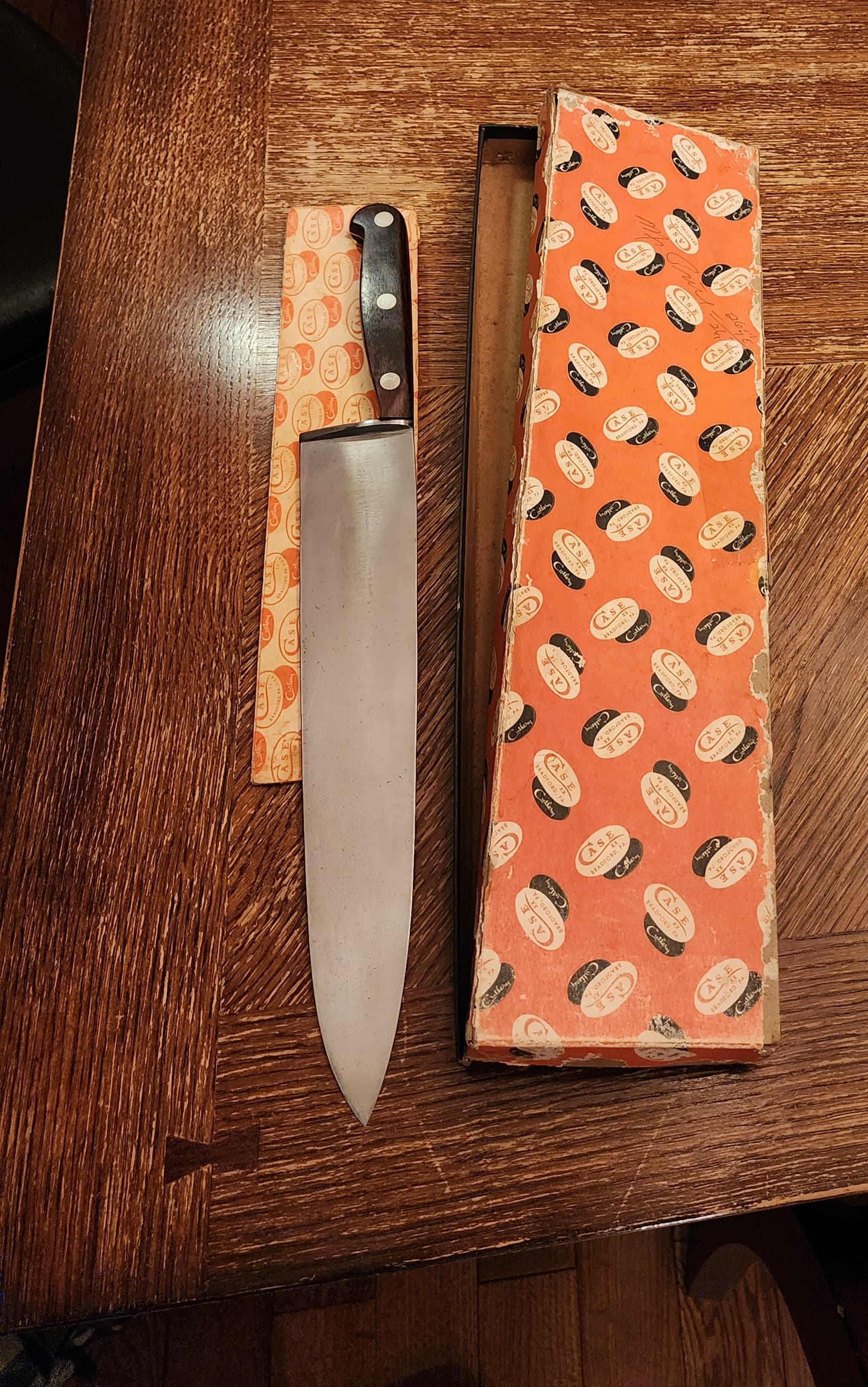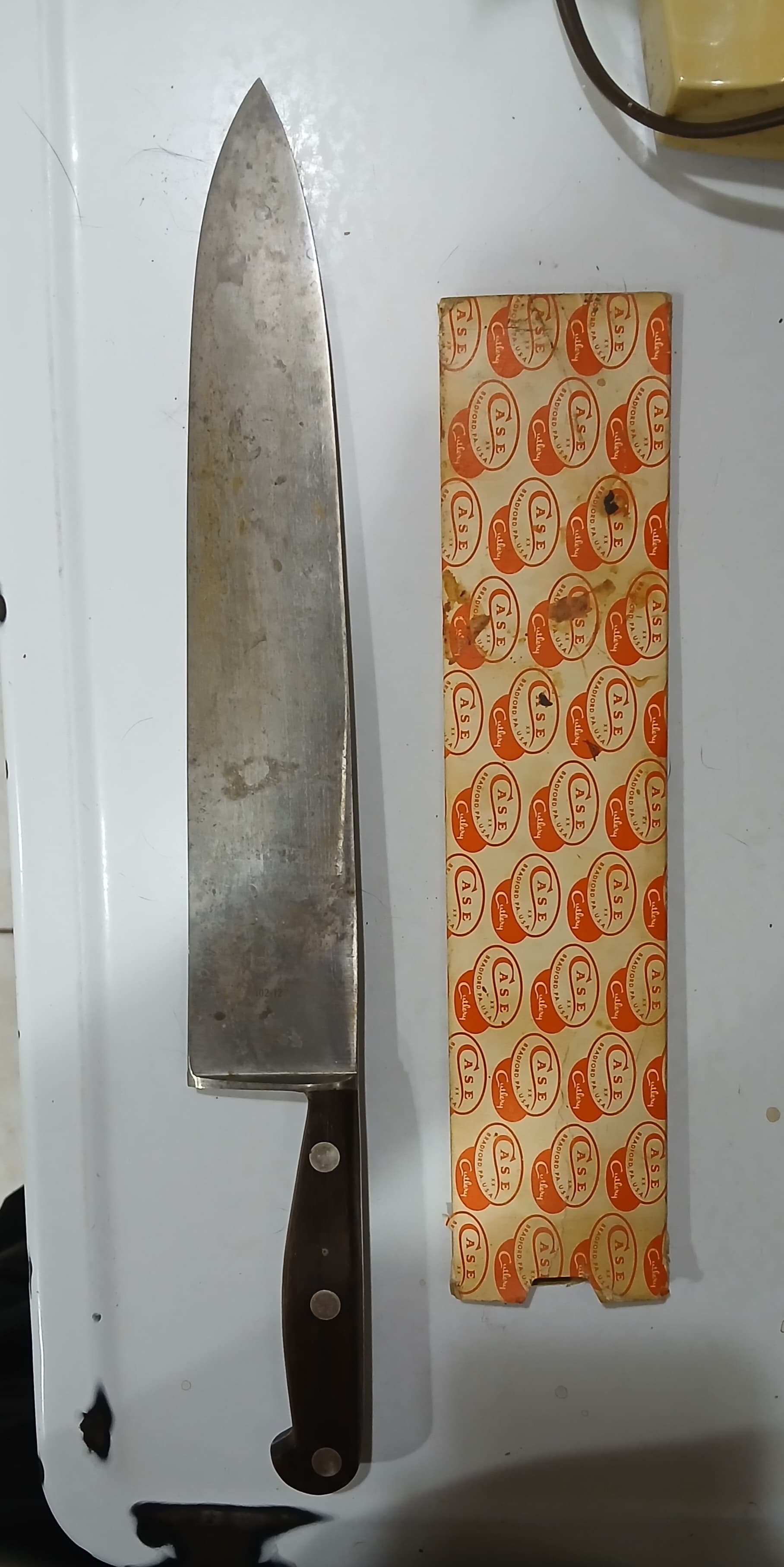 Like many I spent hours trawling through the likes of Ebay which is easier said than done being UK based given our laws on online knife purchases especially from the US. I had some success in the form of the 100-10ā pictured in addition to a Henckelās which was very close but sadly no scores in relation to a true 102-12ā (unsurprising to those who know). I took my search to Europe in the hope that it may be an untapped market with little expectation and looked through what we call car boot sales for second hand vintages knives. This lead to plenty of European and French branded Chefās as youād expect but no Case. I did however in doing this form a friendship with an individual who specializes in house clearances and took an interest in my story and love for H1. To cut a long story short it was around 6 months later I gained a message that they think they may have found what I was looking for matching the description of a large Case pumpkin box. To my surprise it was indeed an excellent condition 102-12 rumoured to have been brought over from the states as a gift sometime in the 70ās/80ās and remained unused in what we call a loft ever since. The inner paper lining was sadly too far degraded so I replaced this with a modern equivalent sourced from ebay but I think it still looks great. The rubber stamp on the front is still legible but has been subject to UV and moisture weathering. I gave the handle a light sanding and treatment with Danish oil which brought out the Rosewoodās original rich grain in addition to carefully polishing and treating the blade with food grade mineral oil.