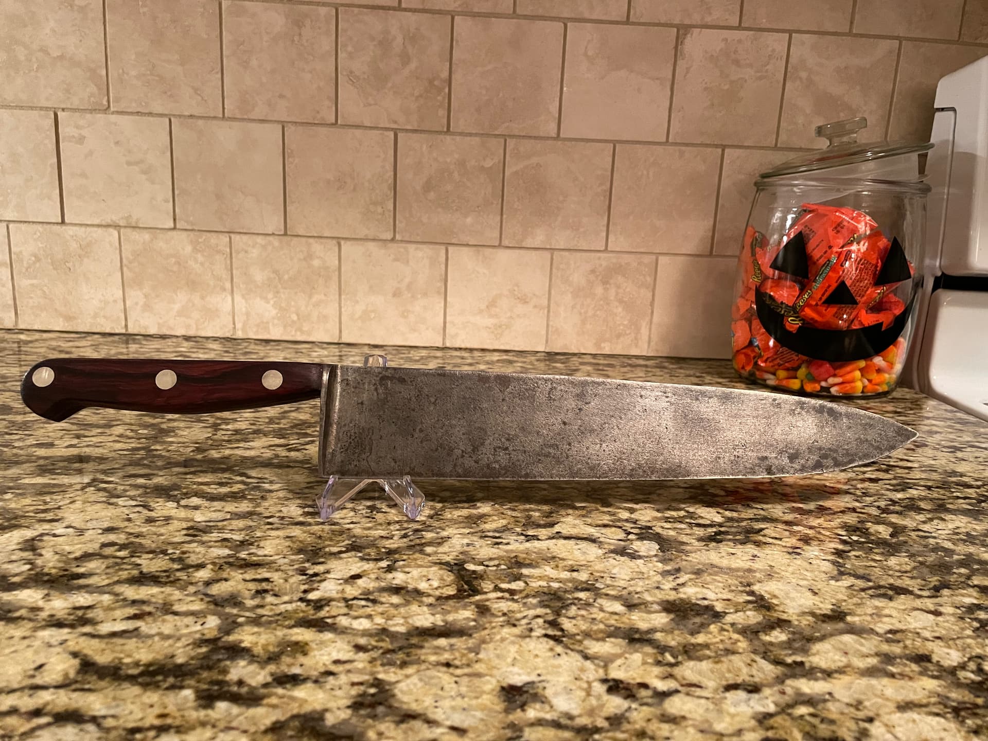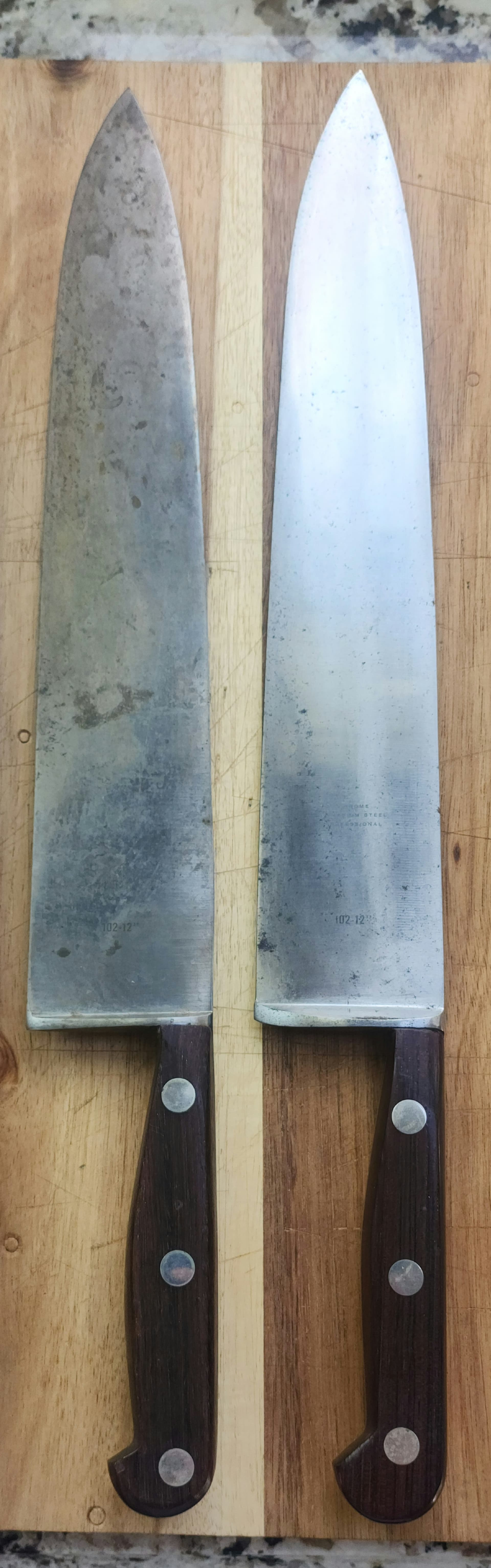 Your knife is amazing and a perfect representation of what is seen in the sales catalog prior to the late-stage changes. Iāve never seen one so accurately nail the image seen in the catalog. The etchings, in particular, are stellar. Iāve owned 4.5 102-12s now. Iāve sold two of them. The .5 is a 102-12 that was cut in half and used as a cleaver. None of mine have had the makers marks as clear as yours. Iām envious. Even the NOS knife has etchings that are extremely superficial, very faint.