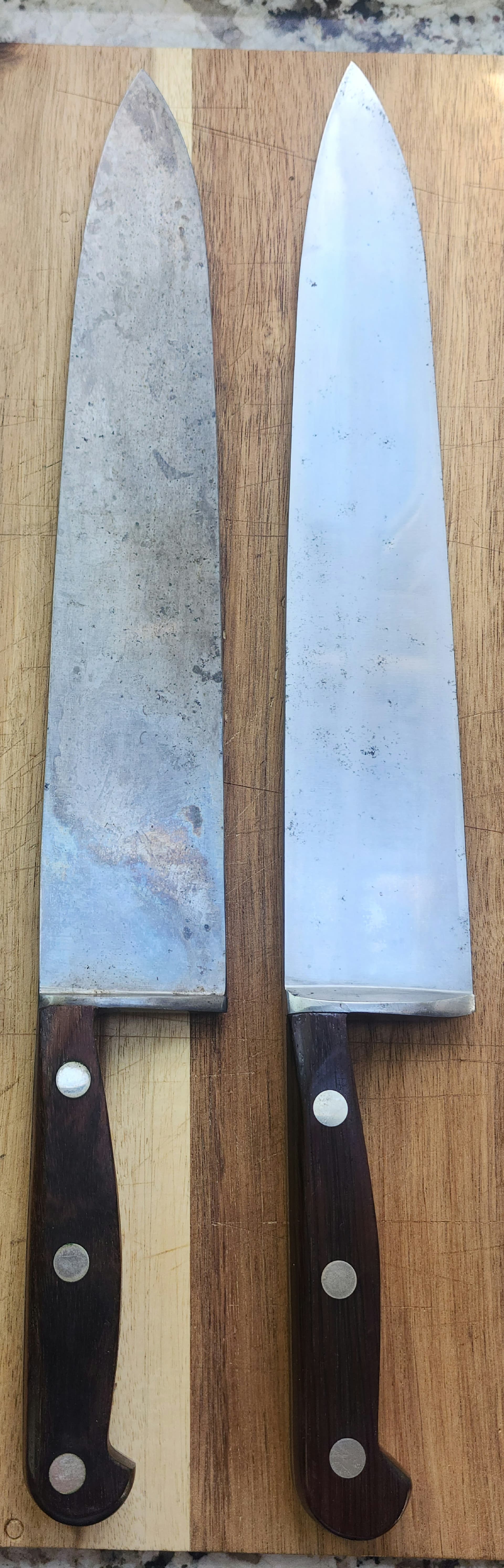Here are a couple of photos of the NOS knife and the knife I bought from 102124U prior to me removing the patina and selling the NOS knife. You can see the differences I mentioned above. Iāve included two close-ups of the handle, too.
