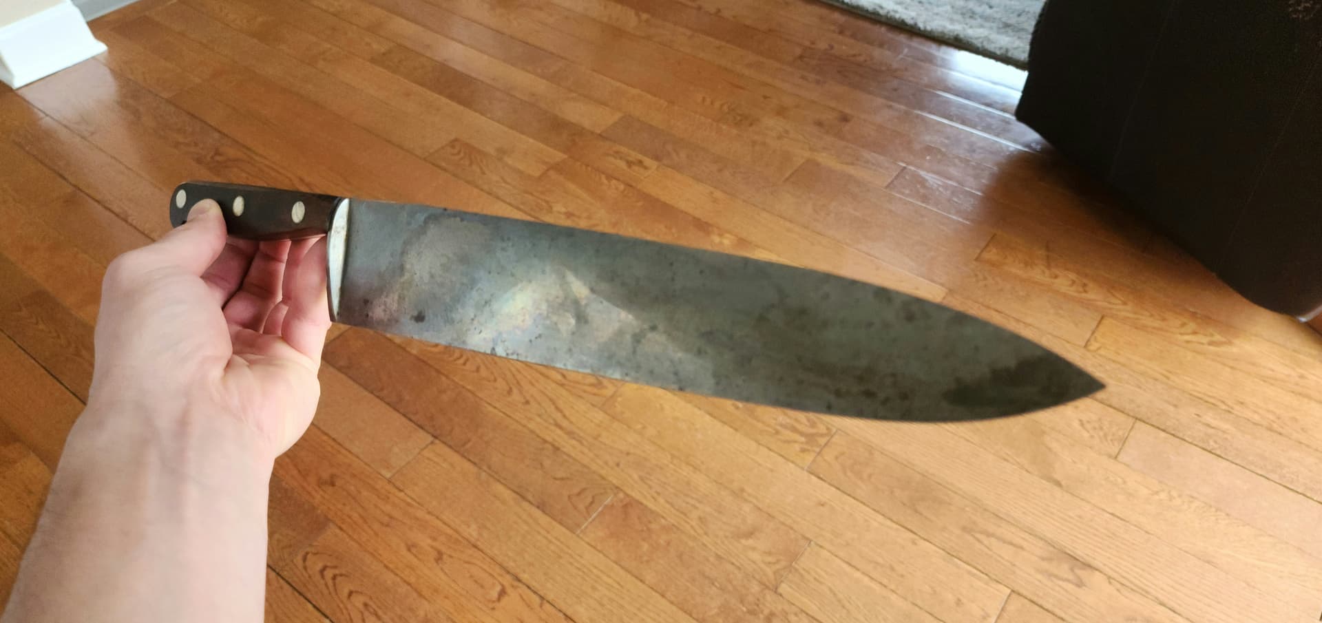 The knife pictured above in both photos is the same knife, the one I bought from 102124U. The top photo is the sellerās and features the patina still on the blade. Iāve since removed the patina. The bottom photo is one I took last night.