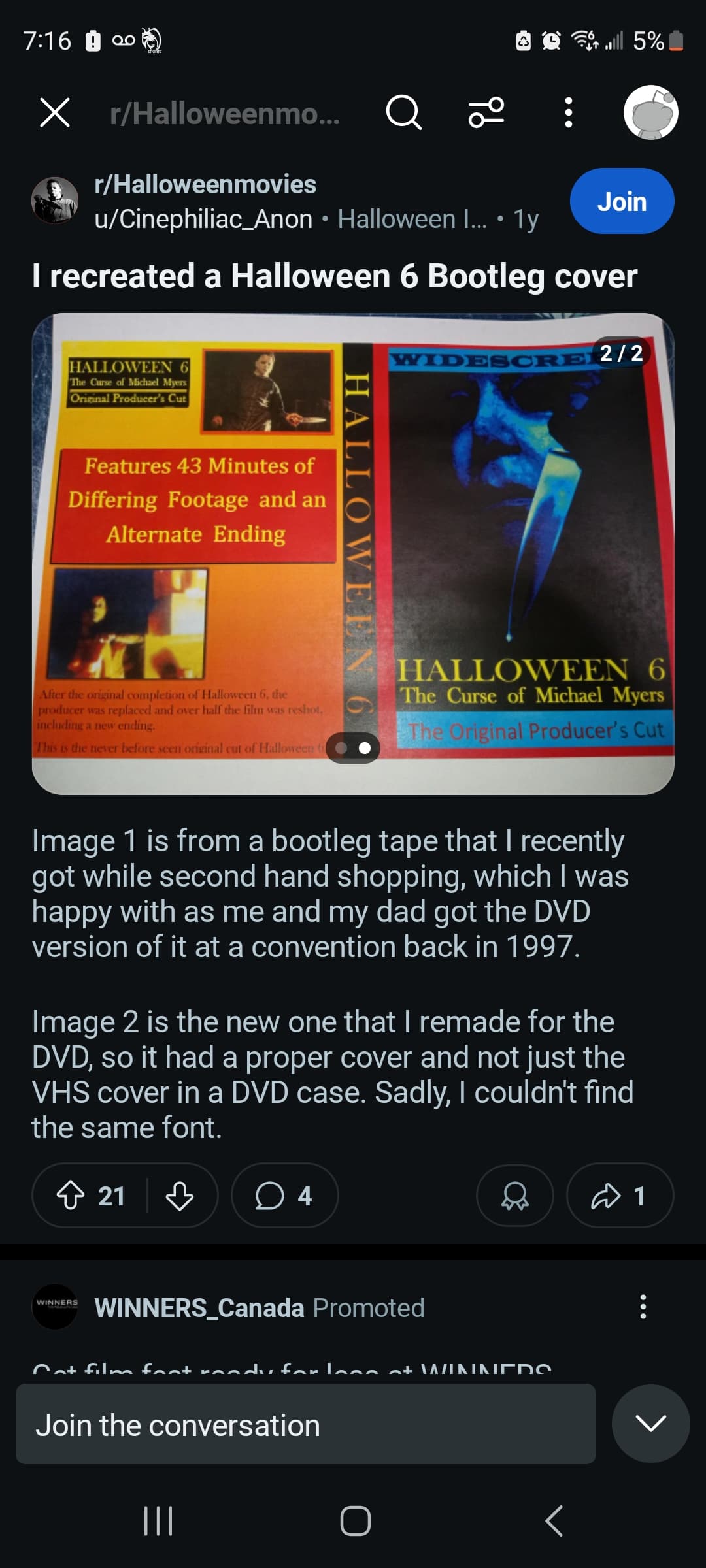 When Halloween: The Curse of Michael Myers was first released, I remember a friend of ours had a VHS copy—one of those shaky, bootleg tapes. He even gave me a copy, however it was so poorly made that it looked like someone filmed it with a camcorder from inside the theater. It turned out, it wasn’t even an official recording. The whole thing was pretty terrible, honestly unwatchable. Still, I really appreciated the kind gesture; knowing I am such a big Michael Myers fan. The tape didn’t even come with a proper sleeve or artwork, probably just taped over something else with one of those masking tape labels that read: MM H6 CURSE PRO. Honestly, it was pretty junky. If I still had that tape today and decided to sell it on eBay, I think I could have gotten a few hundred bucks