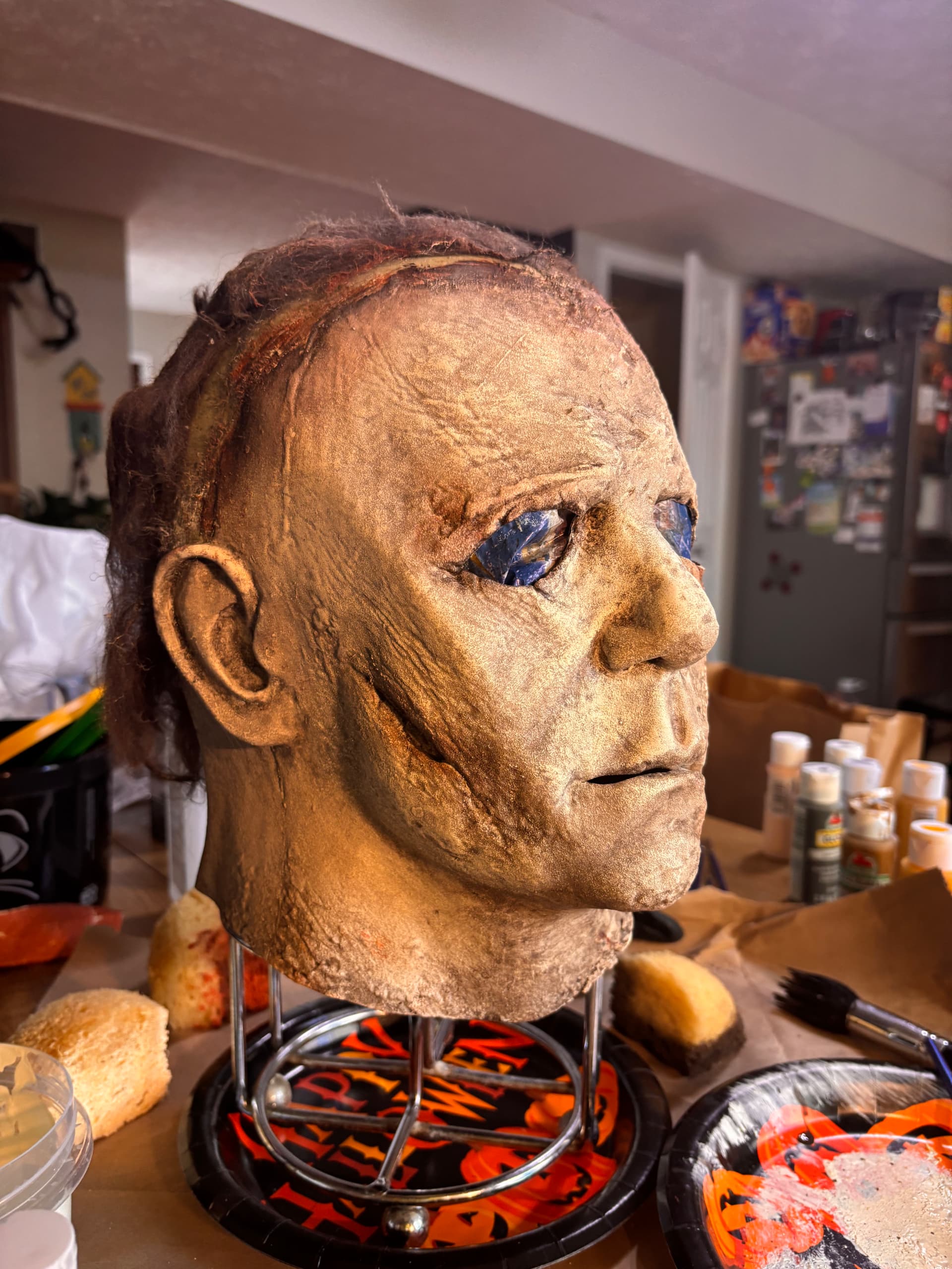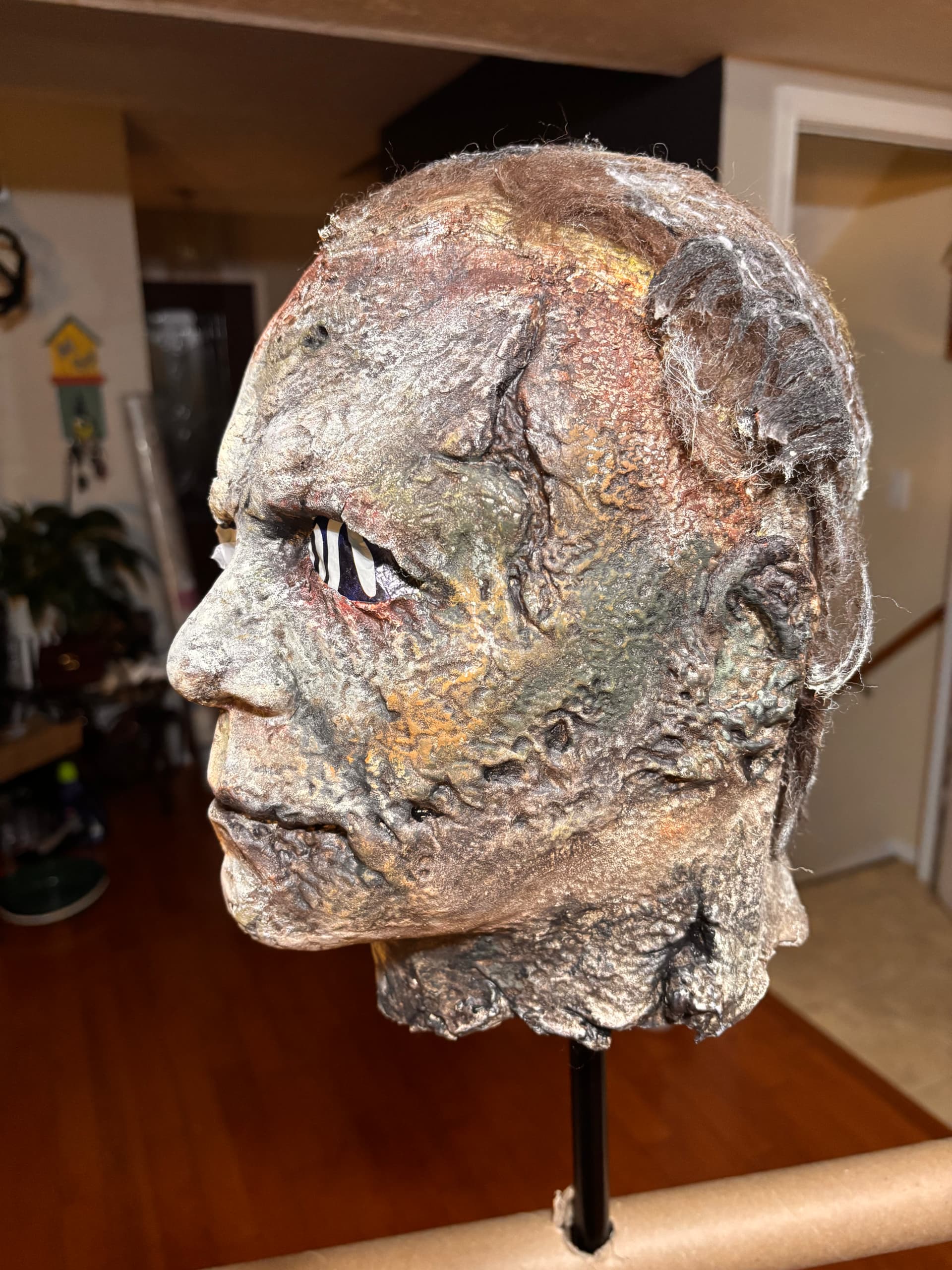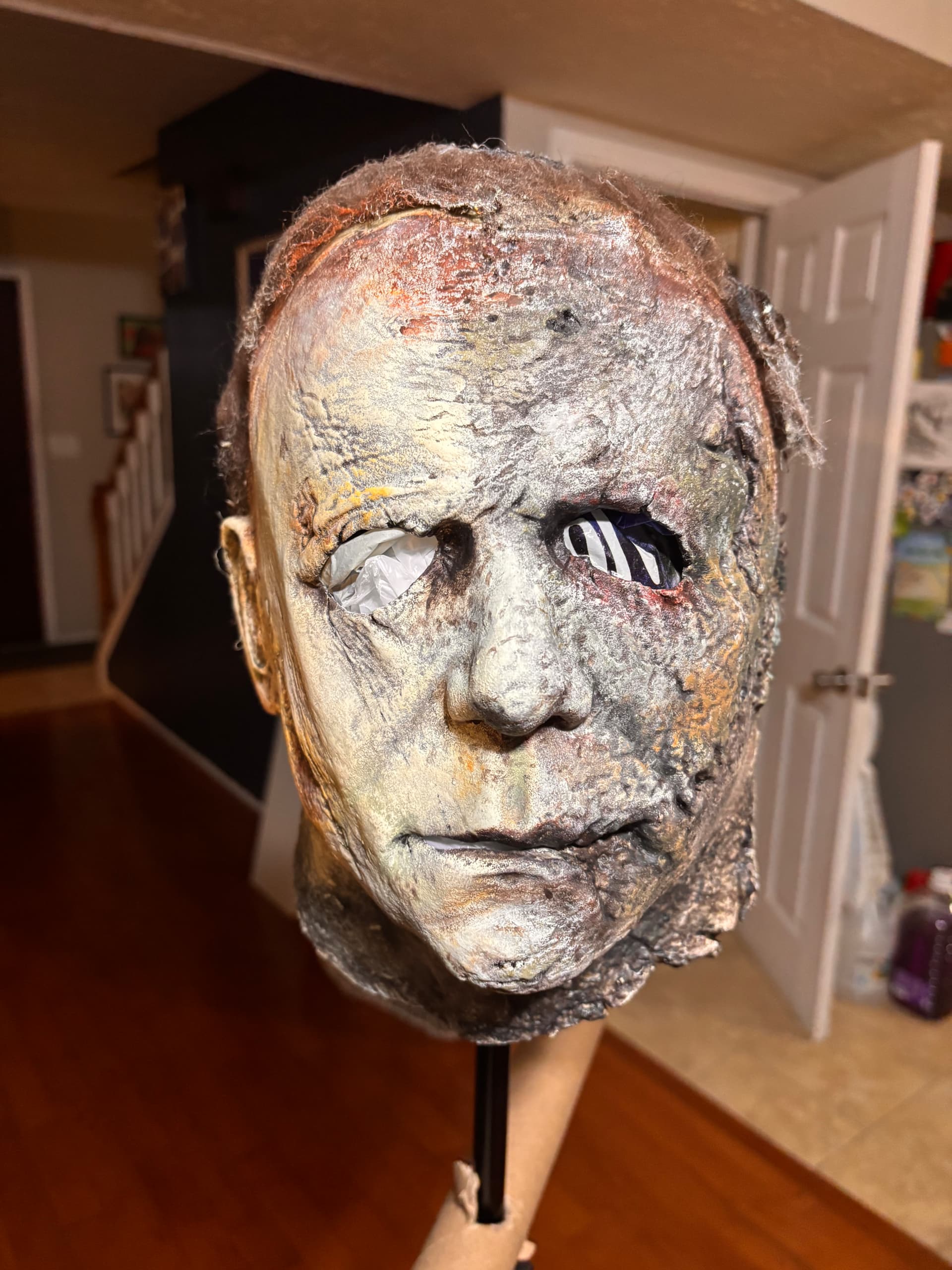 What i’ve done so far on my mask. I’m like the look a lot right now. I did a off whitish base and then some reddish brown around the hair and burnt side. Then i did a blackish brown wash and started to wipe some of it off. This is all I have done so far