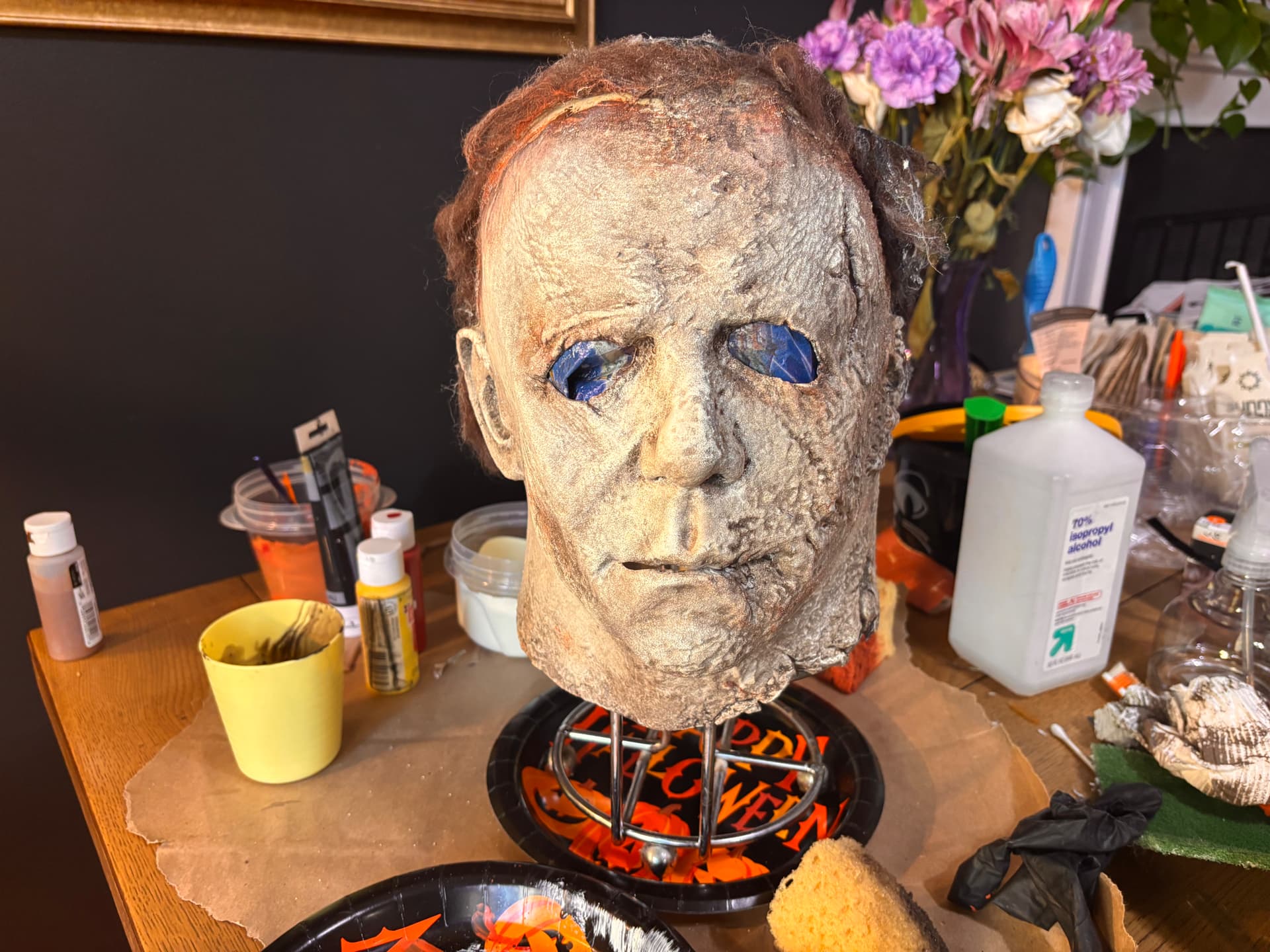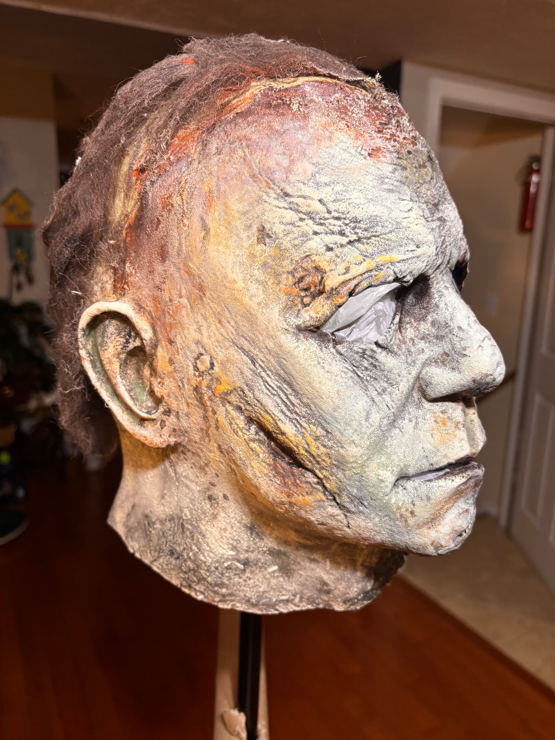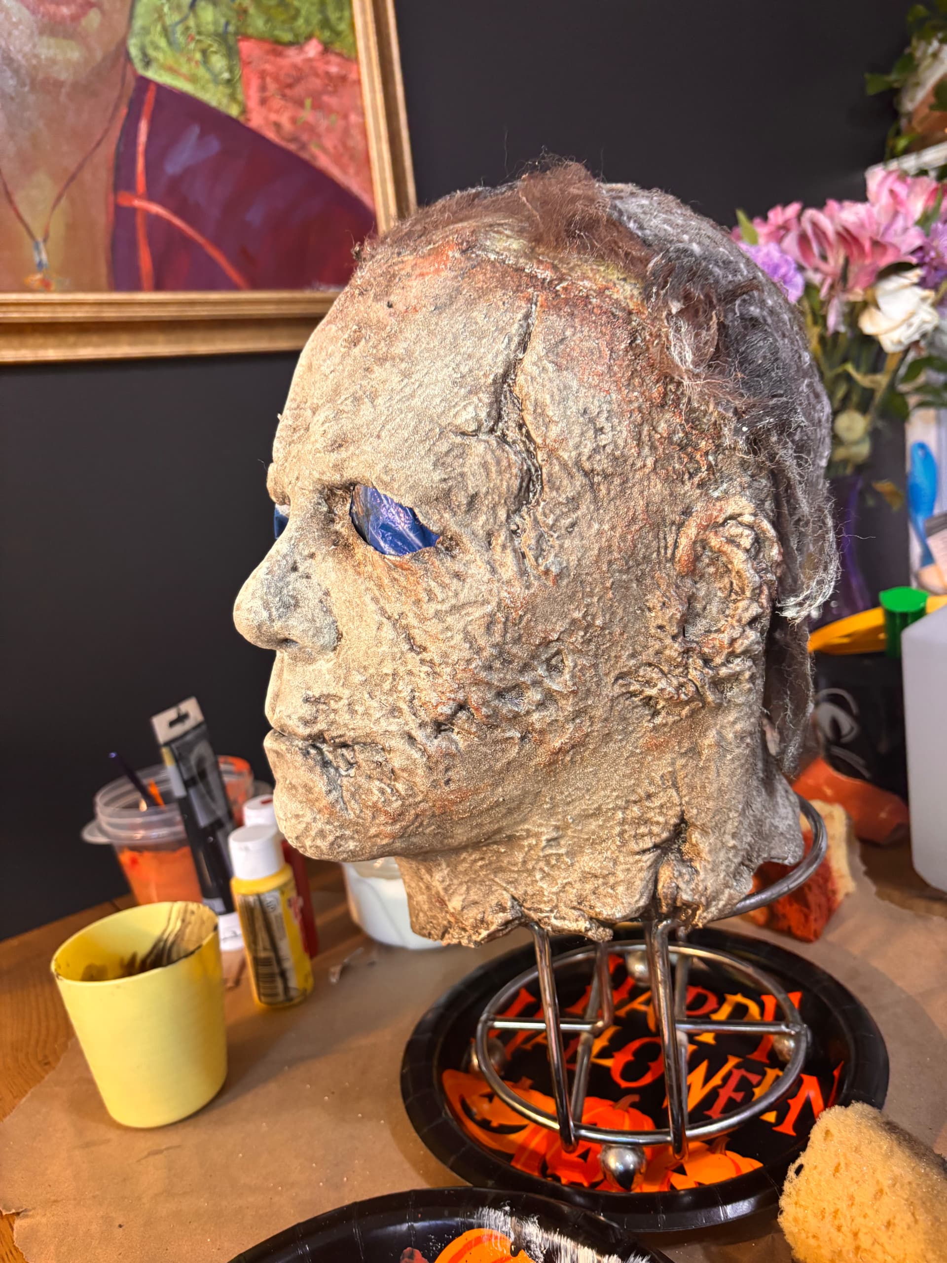 What i’ve done so far on my mask. I’m like the look a lot right now. I did a off whitish base and then some reddish brown around the hair and burnt side. Then i did a blackish brown wash and started to wipe some of it off. This is all I have done so far