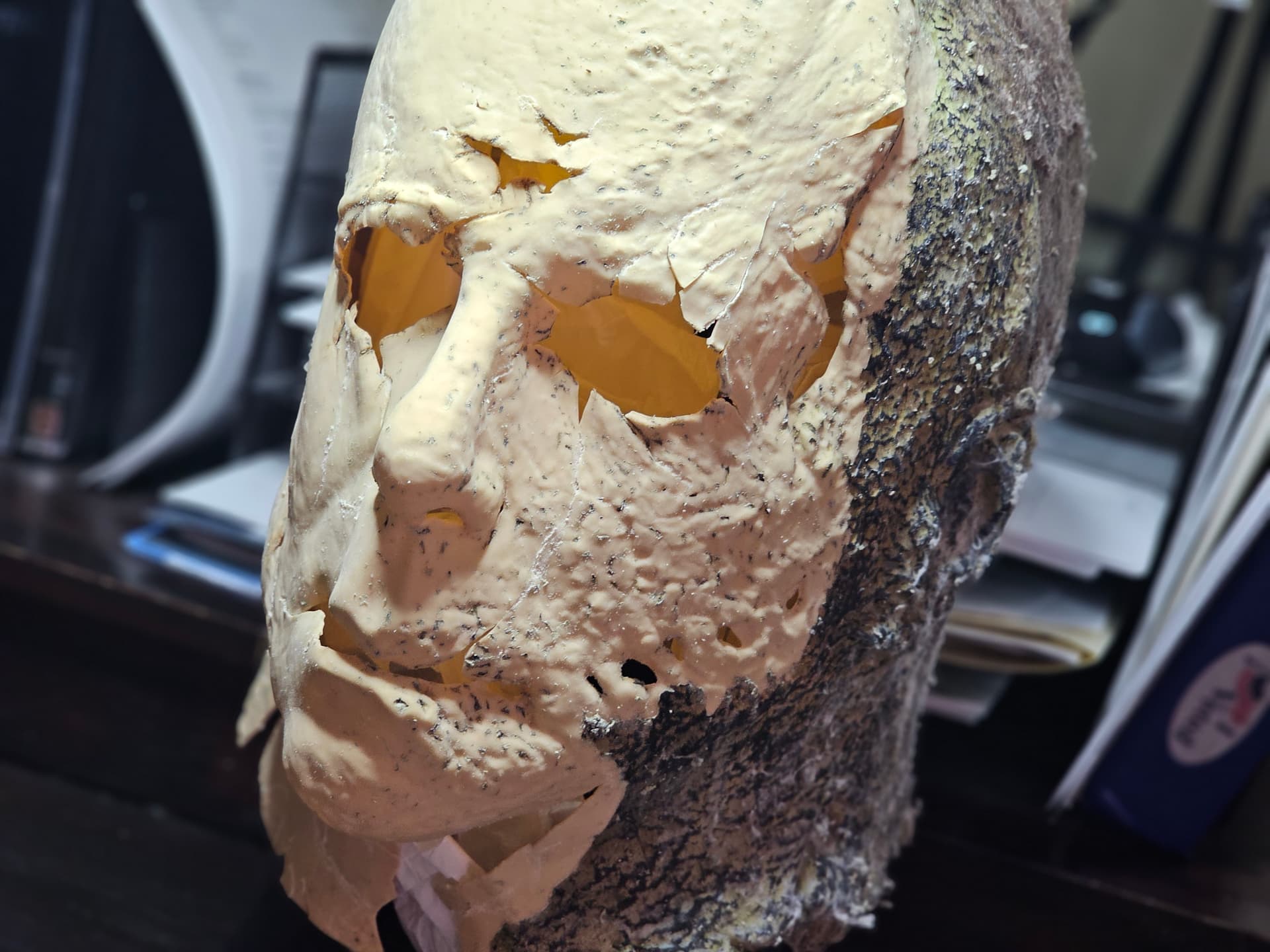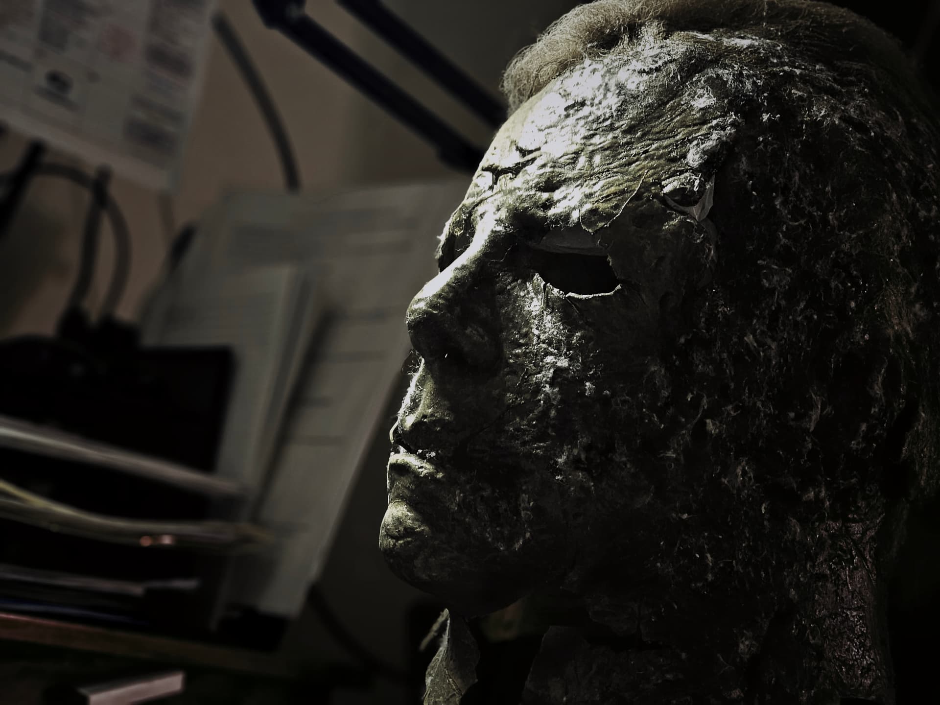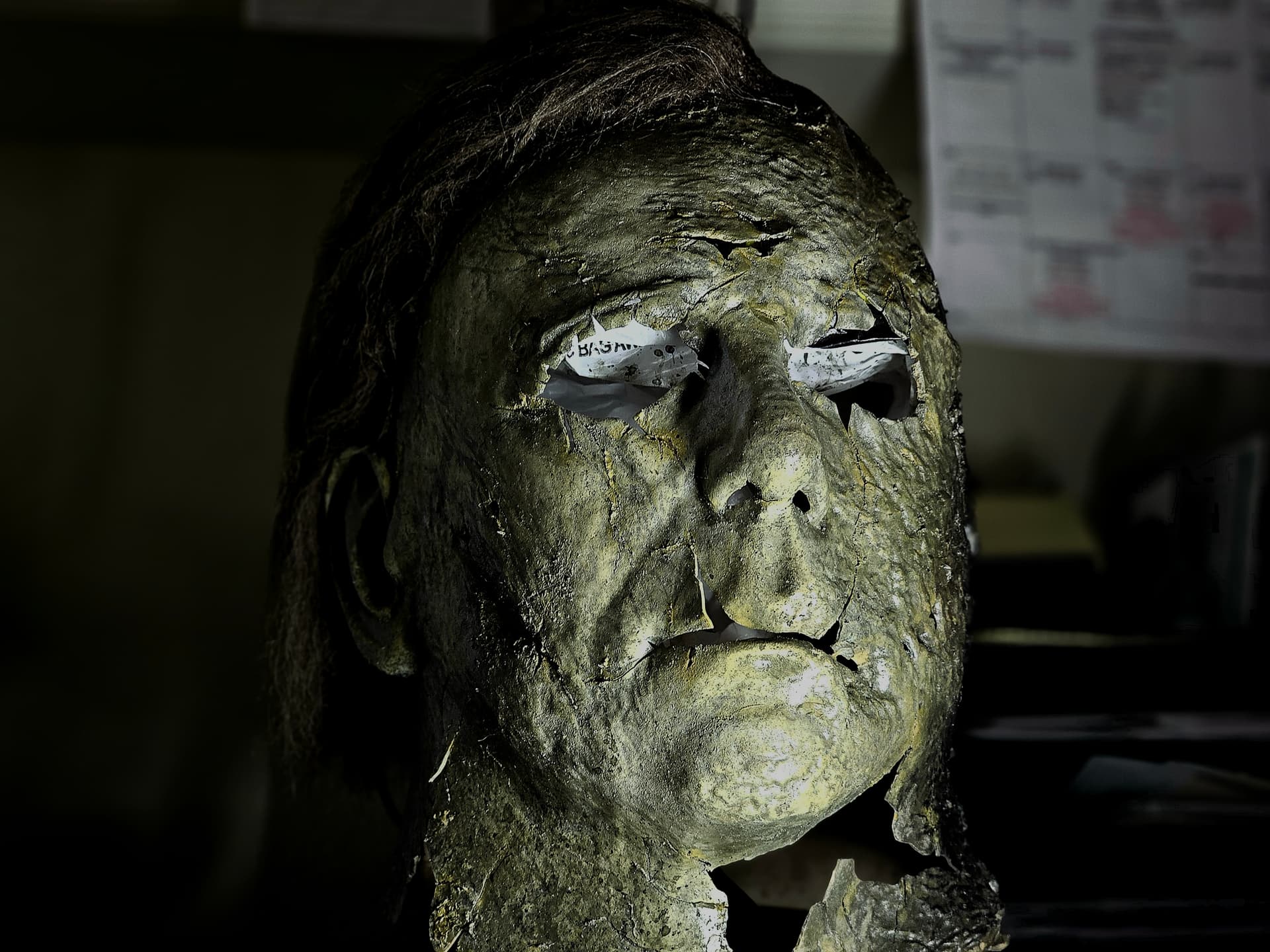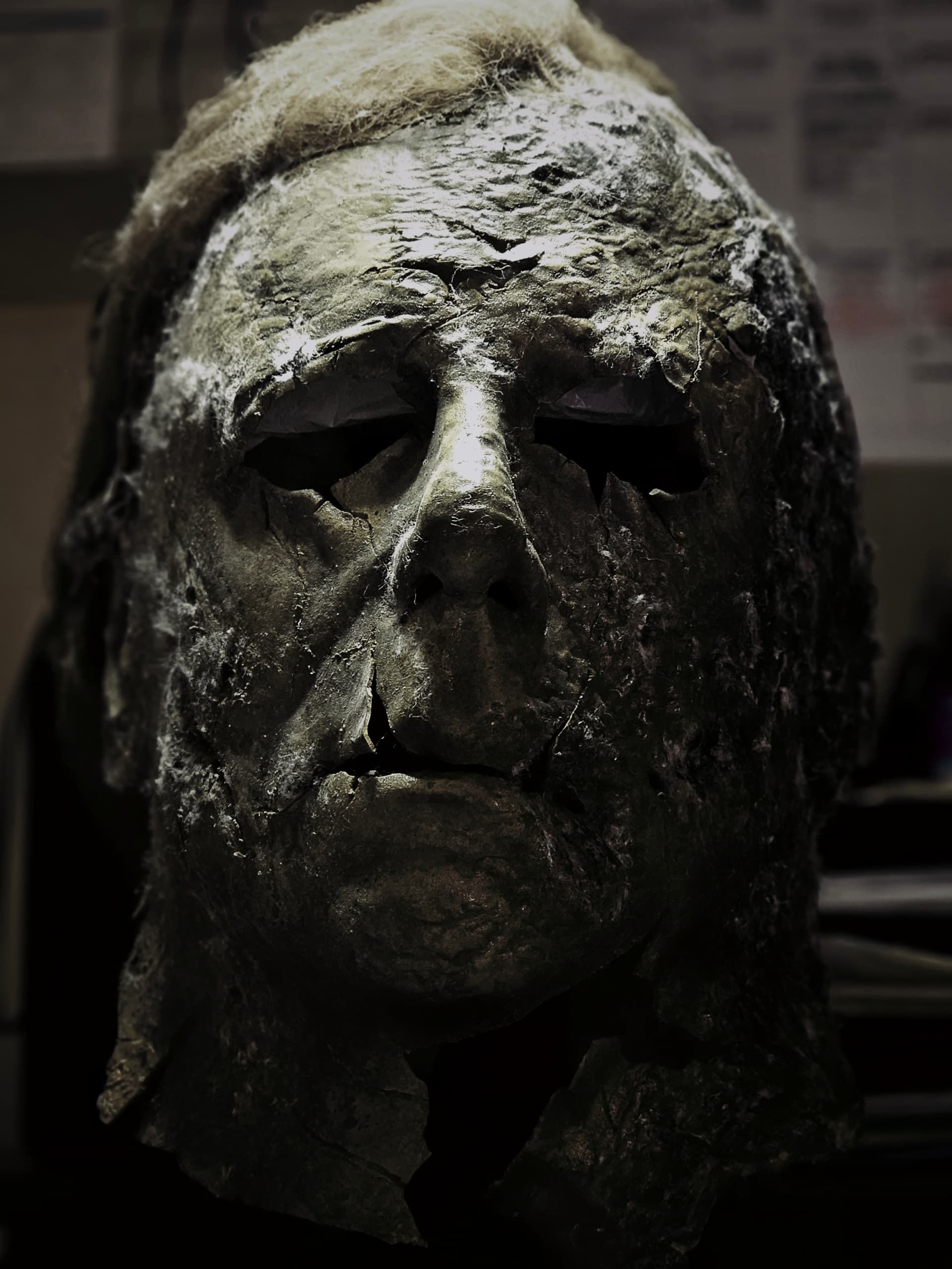 Hi guys. So the night before, I had a nightmare about the Boogeyman chasing me through my neighborhood on Halloween and wanting to kill me. However, he didn’t really look like Michael, he looked more like a creeper, more disturbed and rotten Michael. His mask looked like the Ends mask, however, the rot was way worse than what he was portrayed in Ends. There were brown spotty part where it was rotting, the mask seemed like a crunchy piece of leather. It was almost like the mask was melting the Michael face. His coveralls were also rotting. They faded from a charcoal Grey to a almost light Grey brown. There were holes in the coveralls and you can see his flesh that started to fall off and turn black. This included his hands. Yesterday, I thought of the dream and though “that will be a cool concept”. So, I found a random Ends mask lying around that didn’t really have that much detail and started my conversion. I cut this mask up, applied heat, and ripped it. This is where I am at so far. If you guys want to give me suggestions on what to do with this mask, it is highly appreciated.