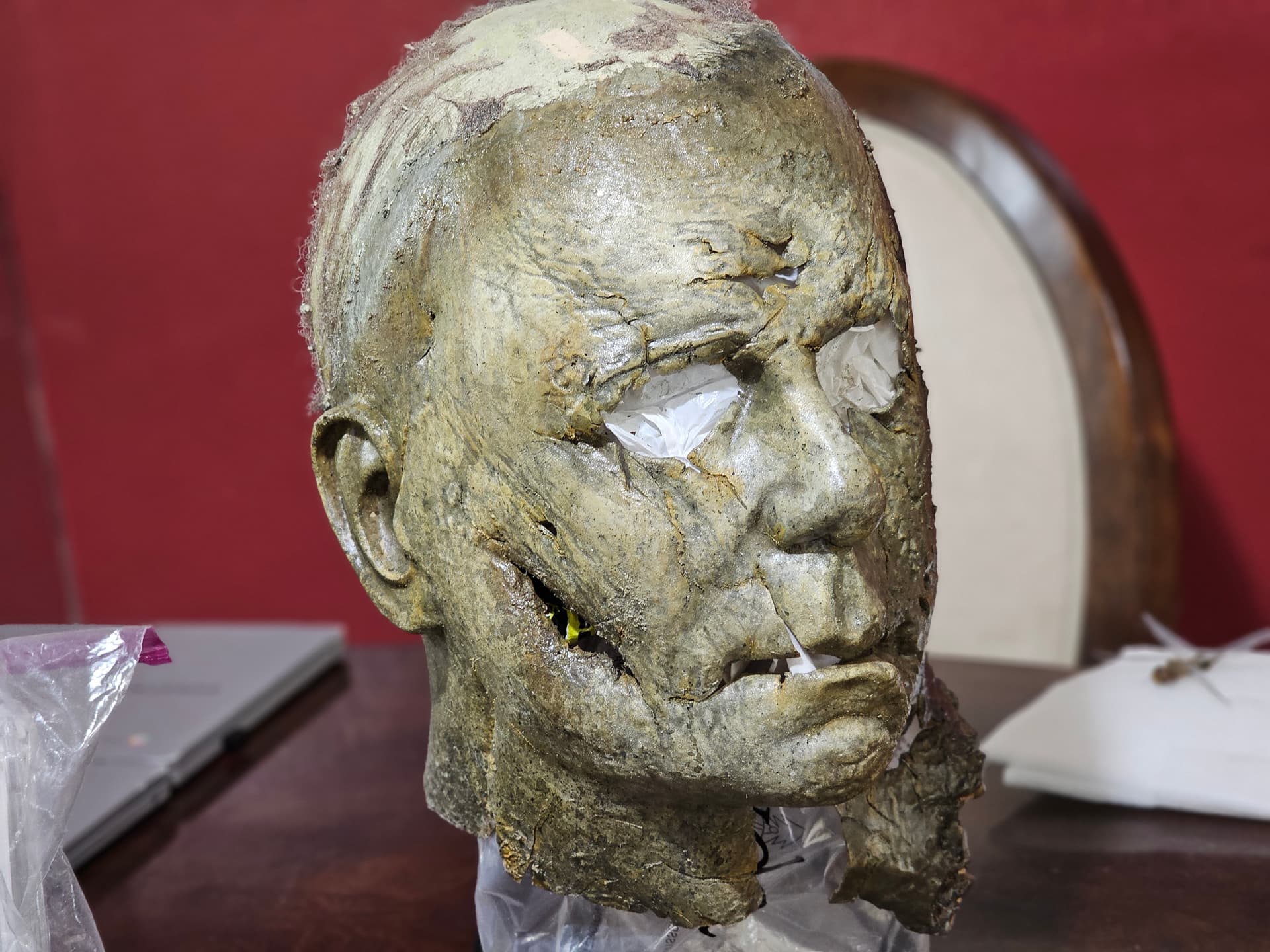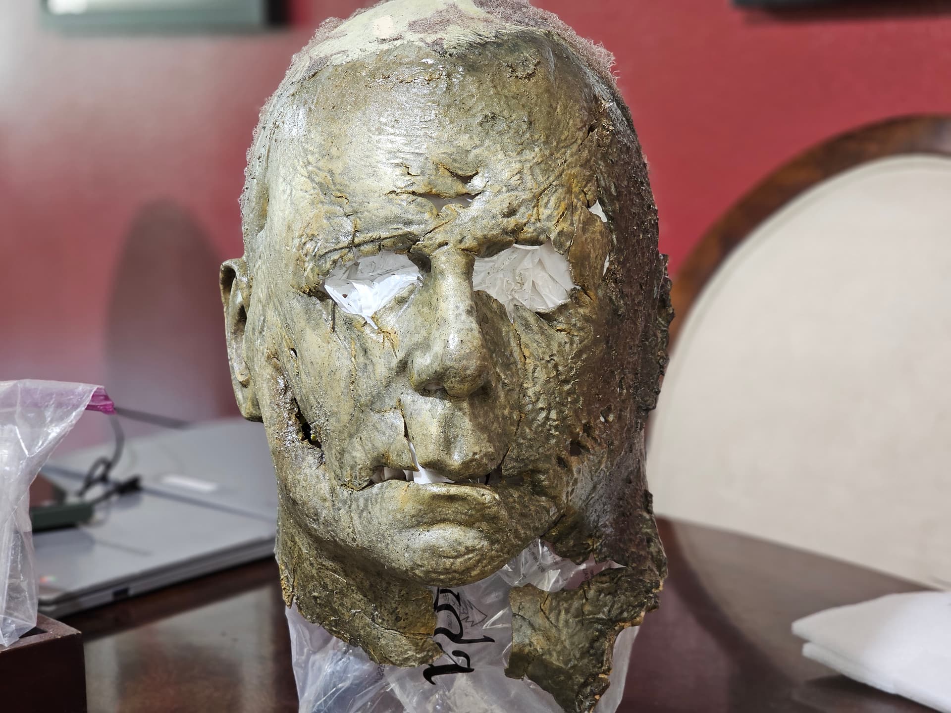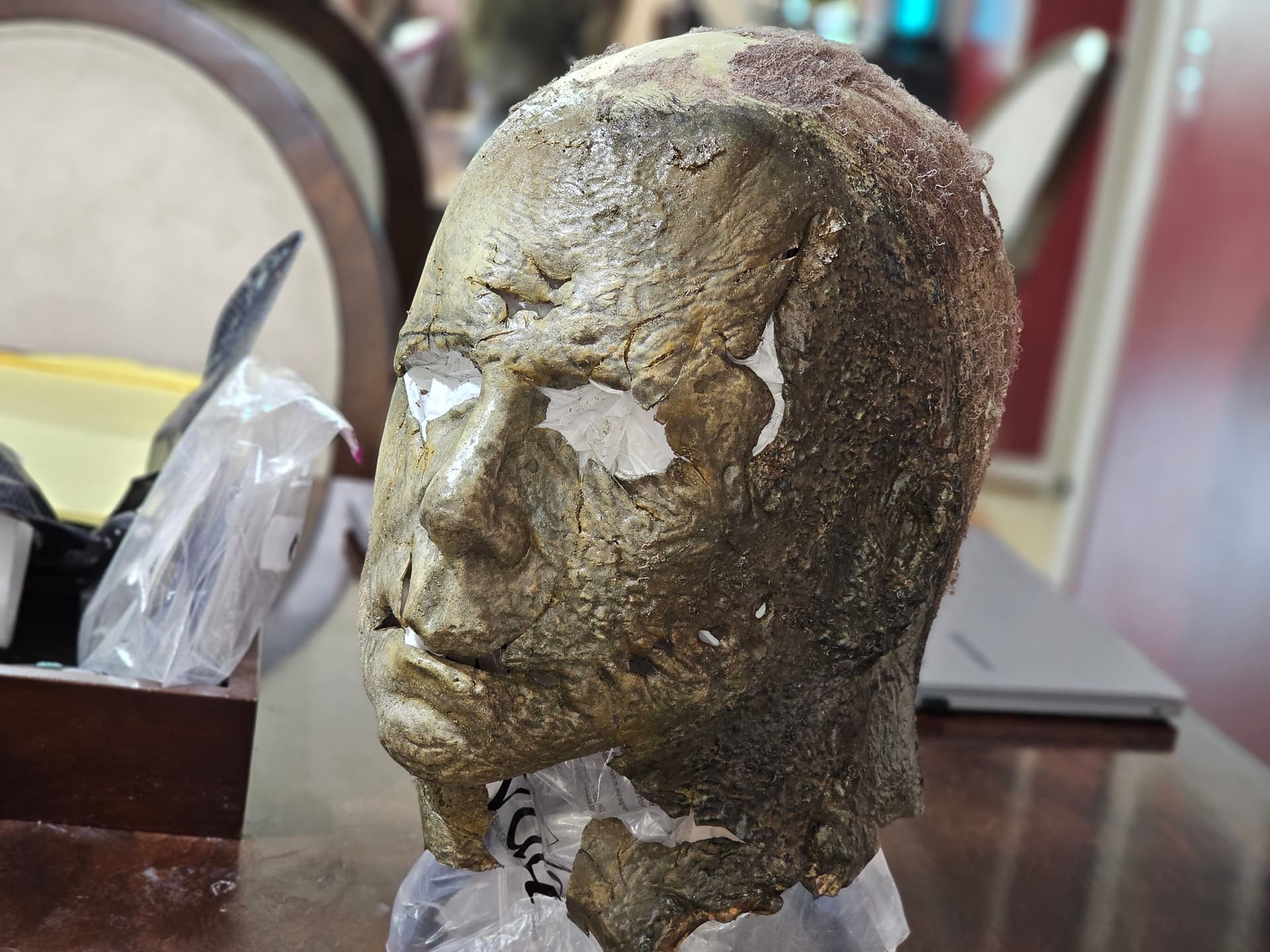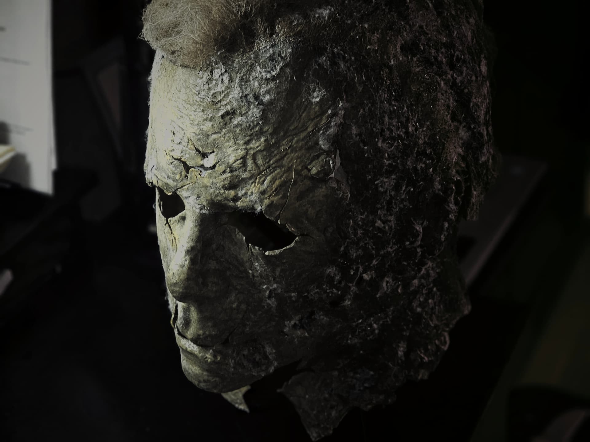 Hi guys. So the night before, I had a nightmare about the Boogeyman chasing me through my neighborhood on Halloween and wanting to kill me. However, he didn’t really look like Michael, he looked more like a creeper, more disturbed and rotten Michael. His mask looked like the Ends mask, however, the rot was way worse than what he was portrayed in Ends. There were brown spotty part where it was rotting, the mask seemed like a crunchy piece of leather. It was almost like the mask was melting the Michael face. His coveralls were also rotting. They faded from a charcoal Grey to a almost light Grey brown. There were holes in the coveralls and you can see his flesh that started to fall off and turn black. This included his hands. Yesterday, I thought of the dream and though “that will be a cool concept”. So, I found a random Ends mask lying around that didn’t really have that much detail and started my conversion. I cut this mask up, applied heat, and ripped it. This is where I am at so far. If you guys want to give me suggestions on what to do with this mask, it is highly appreciated.