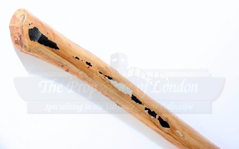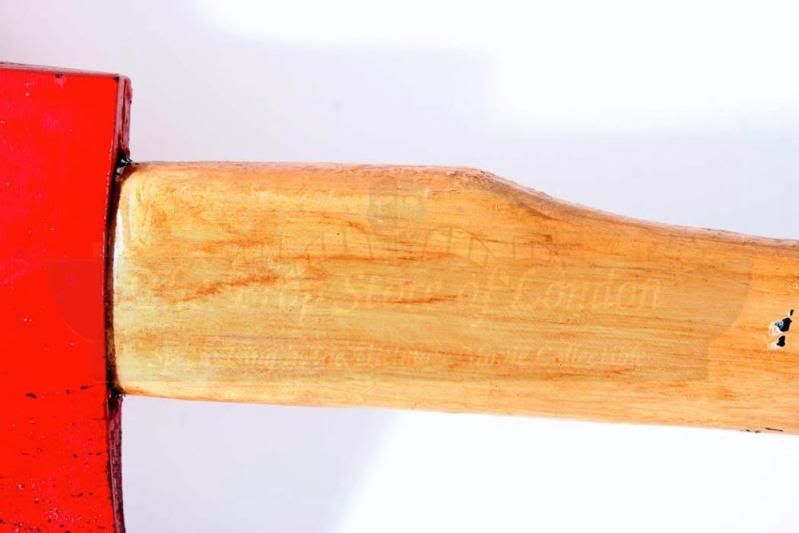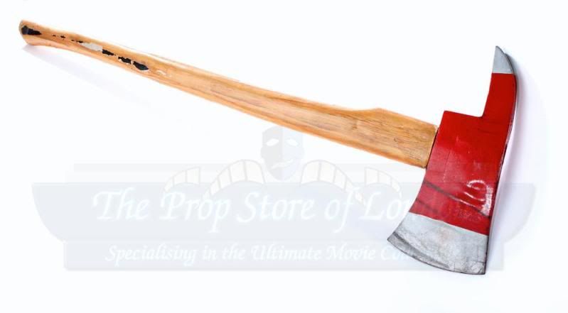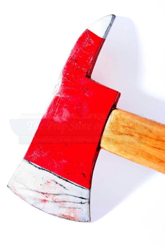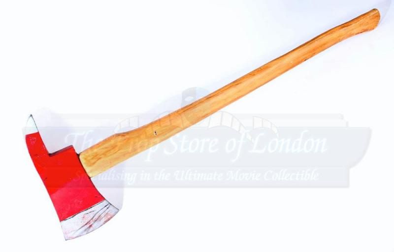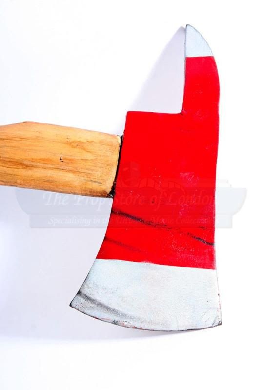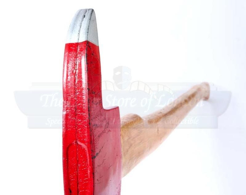 This is a stunt fire axe seen in Rob Zombie’s 2009 follow-up horror film Halloween II. The axe can be seen early in the film as Michael continues his killing spree on his savage hunt for his sister Laurie (Scout-Taylor Compton.) The axe is made of foam rubber for actor’s safety on the set; the handle has been painted to resemble wood, whereas the blade itself is painted red with silver edges giving it a metal look. The blade’s tip still has traces of dried fake blood, evidence of Michael’s murderous rampage while wielding it. The axe has light paint chipping due to production use and storage but overall is in very good condtion, and measures 36” (91cm) long with a blade of 12” (31cm) in length…$1,495.00
