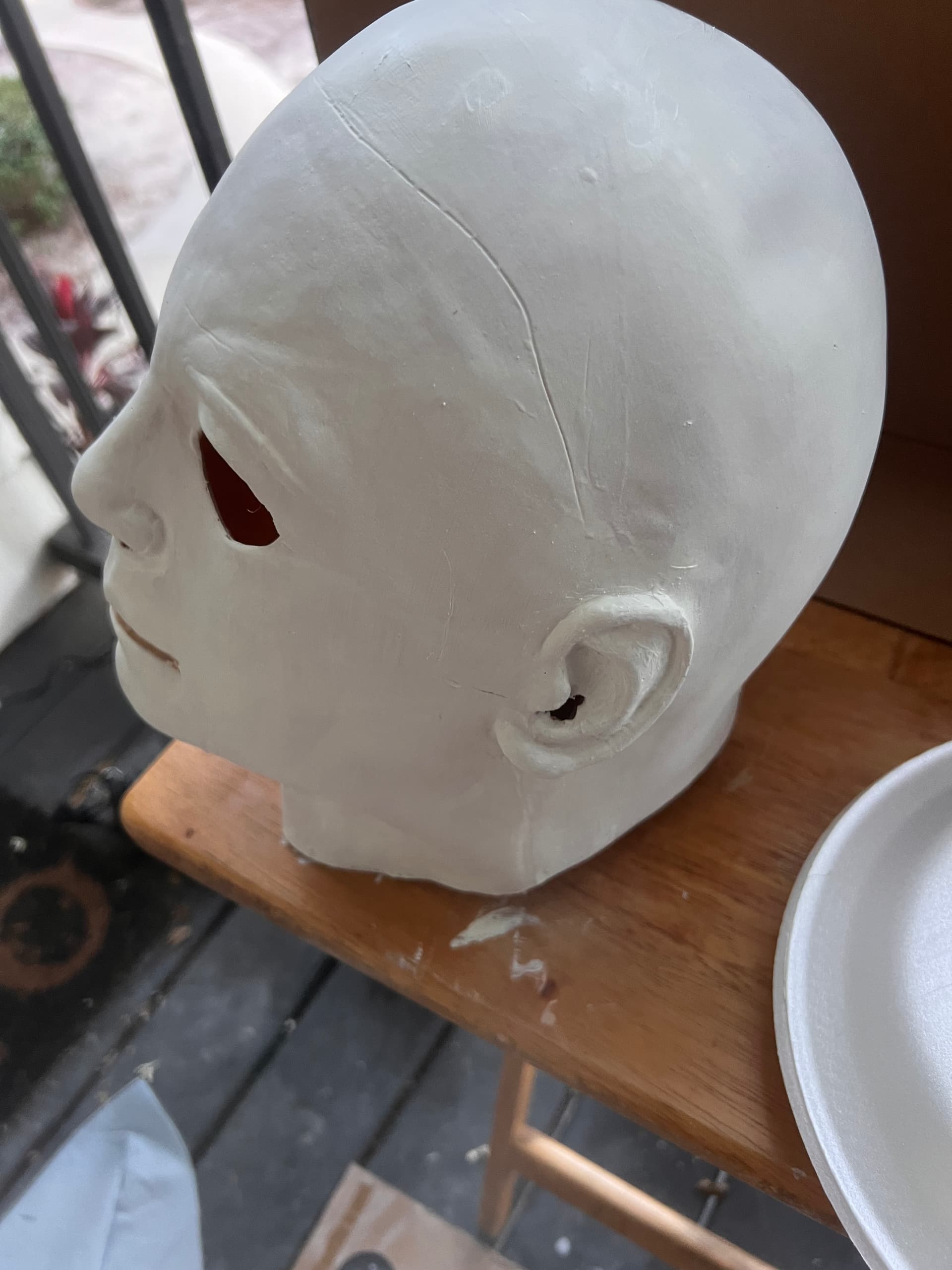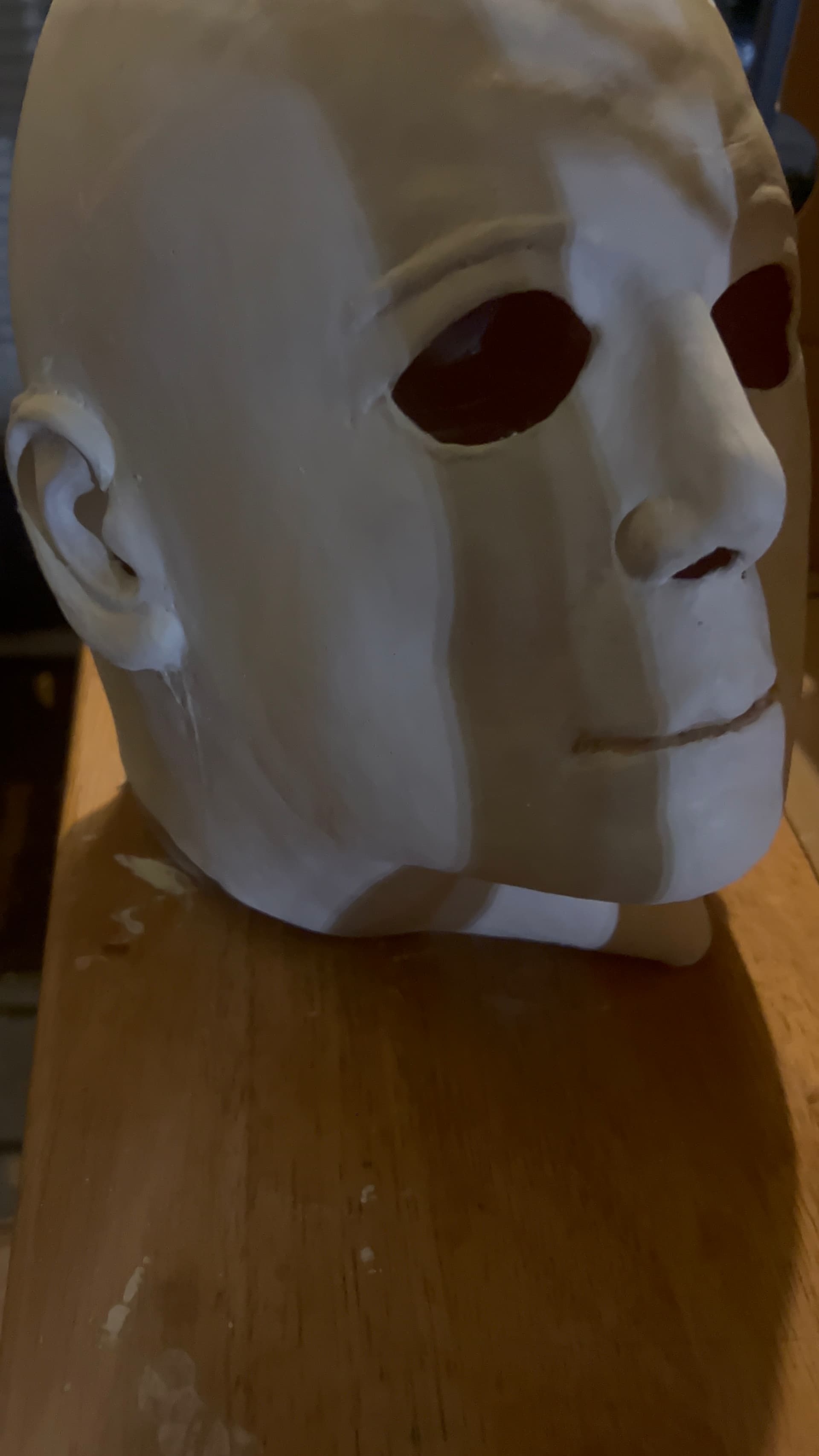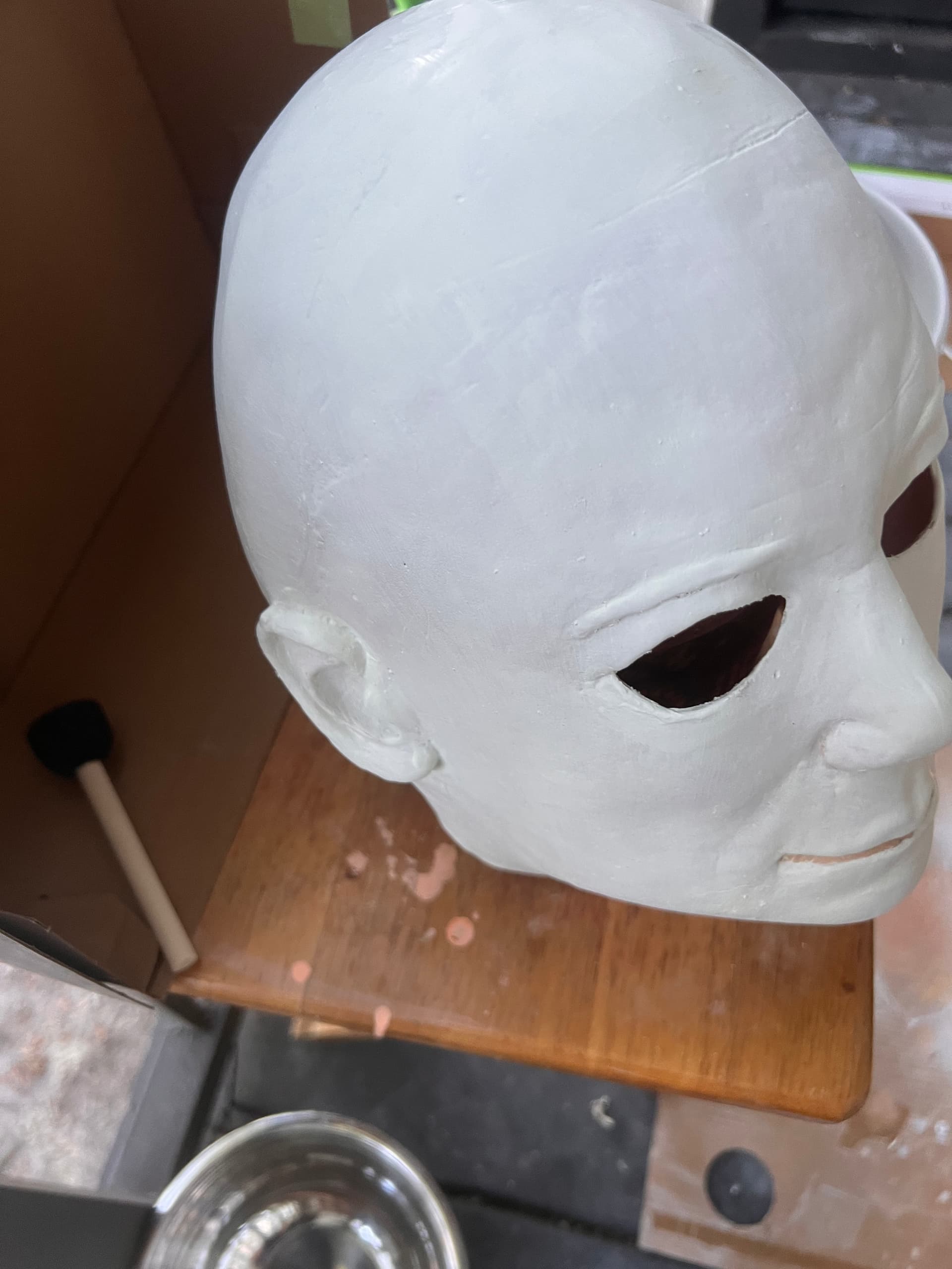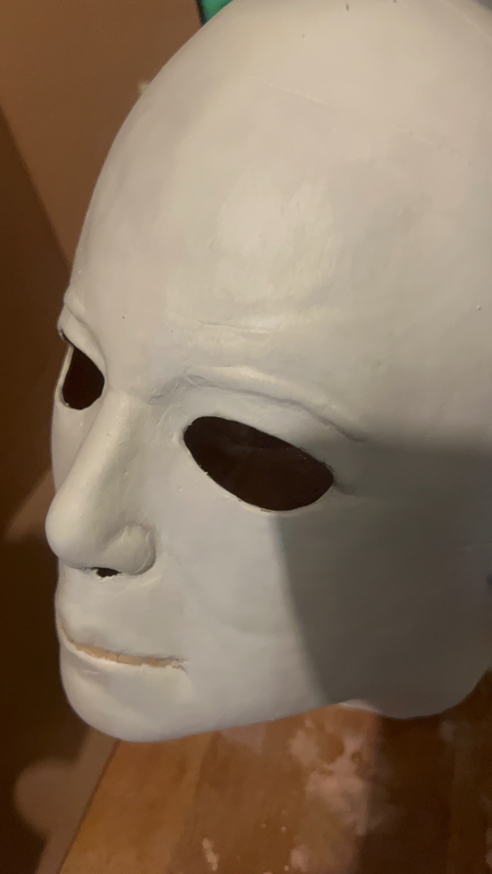Day 2 of paint, 11/7/25. 1 coat. Entire mask is “chalky/ashy” but the paint is smooth and even. The top of the head cracks slightly when mask is manipulated.