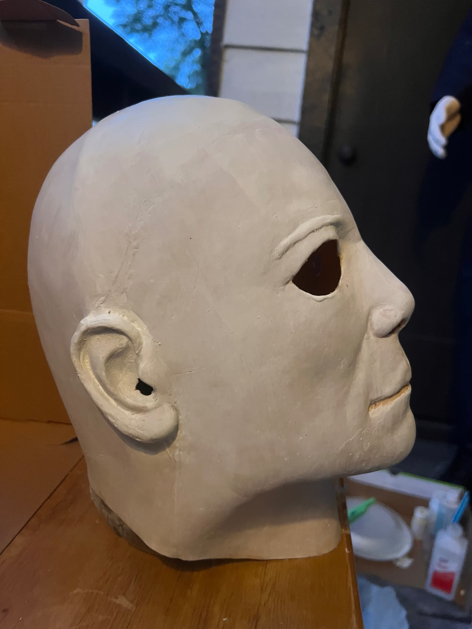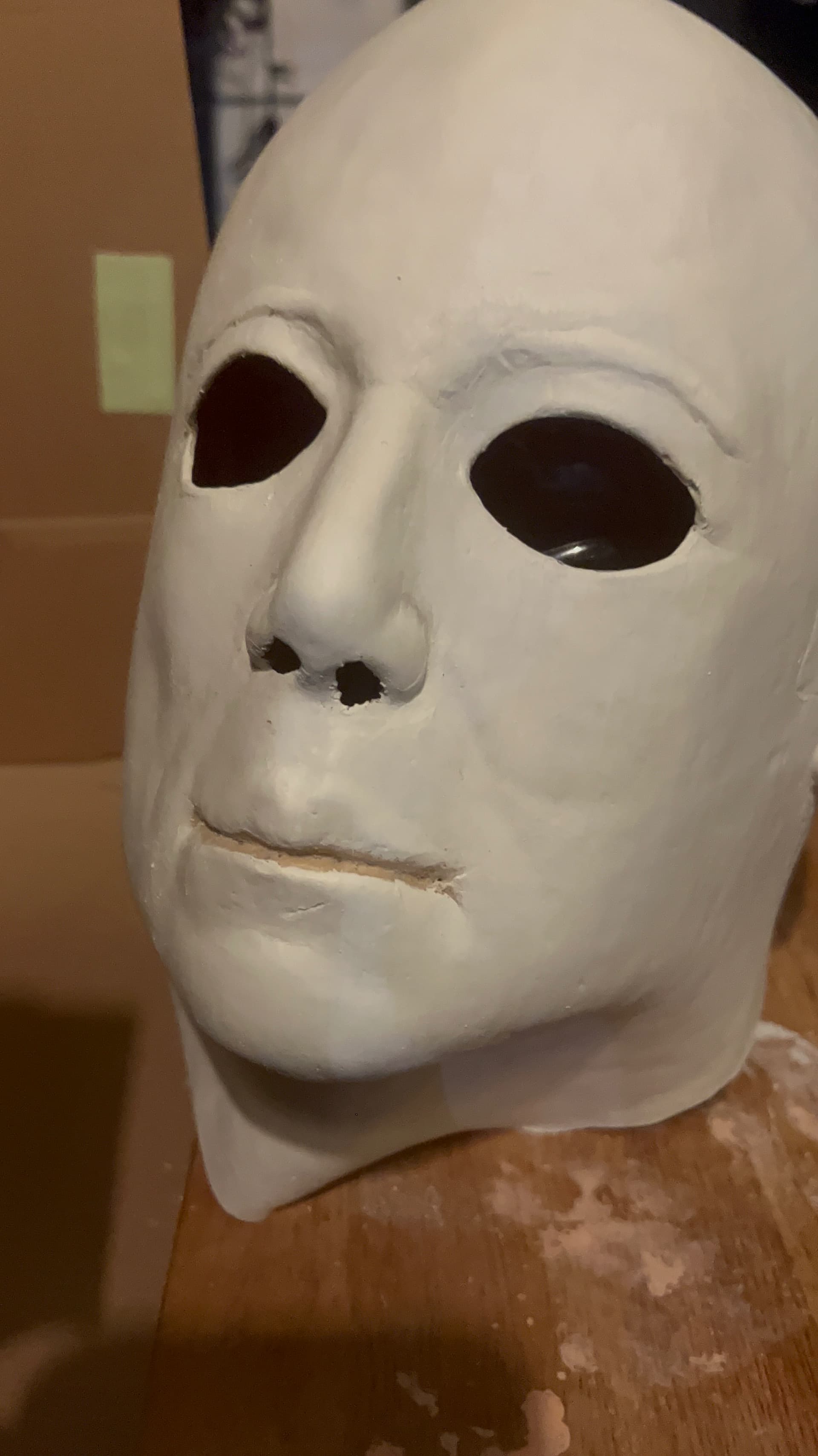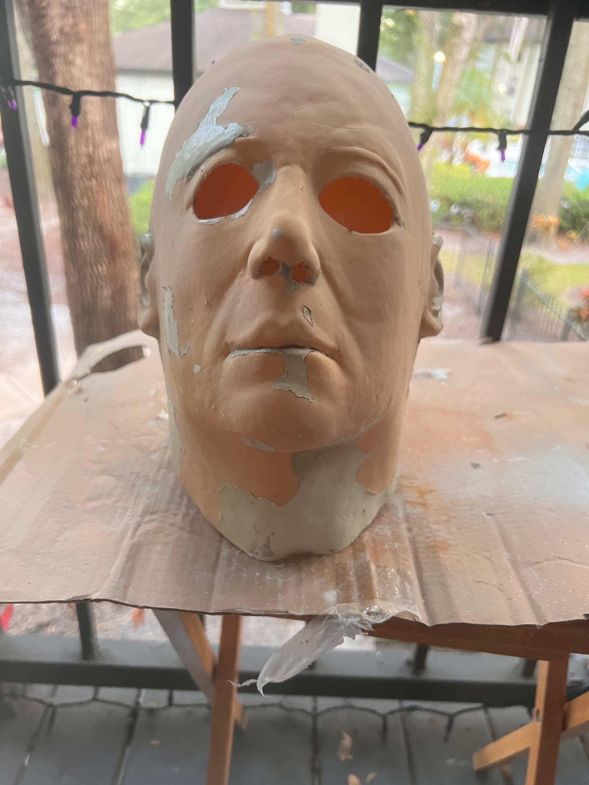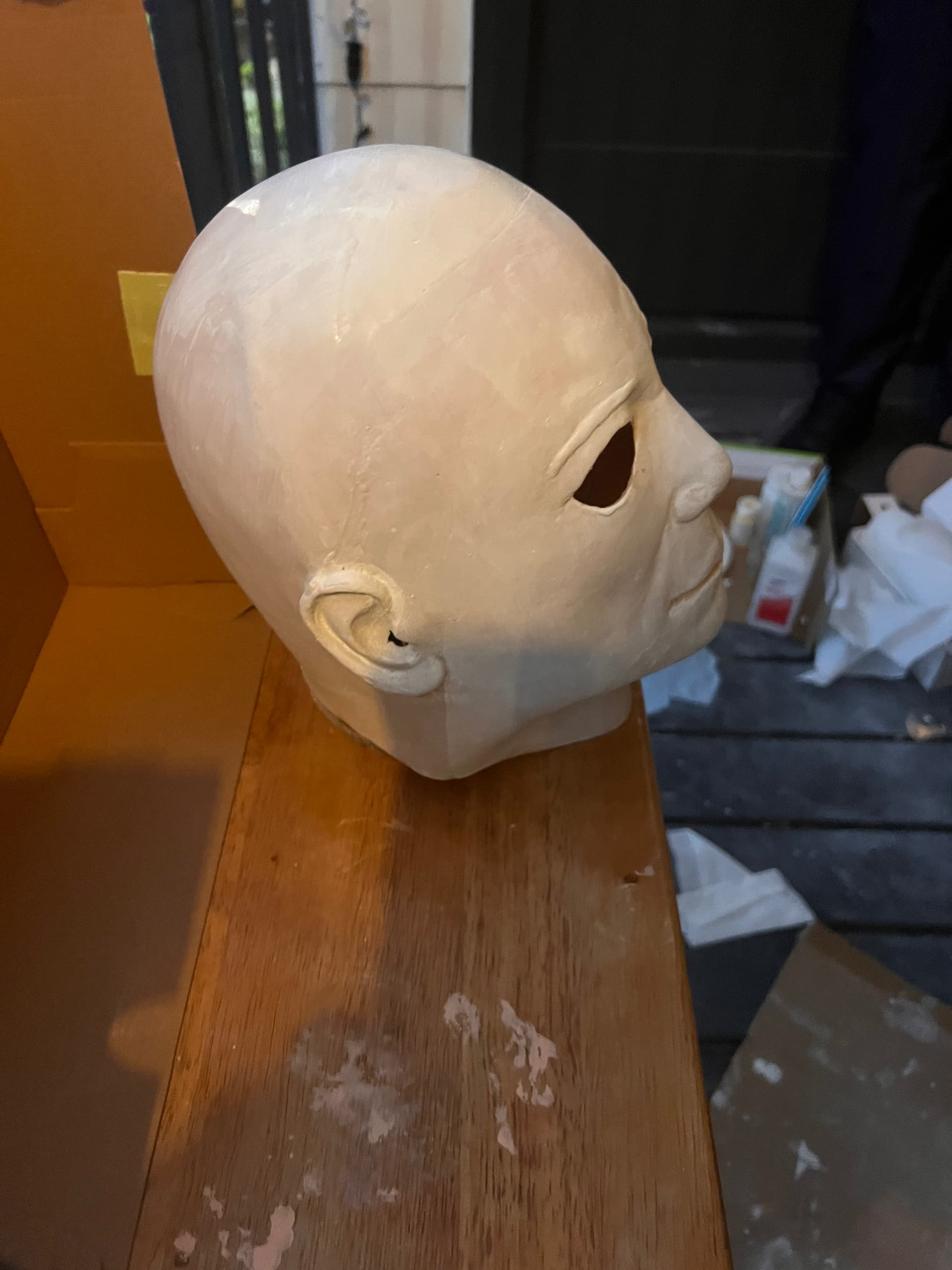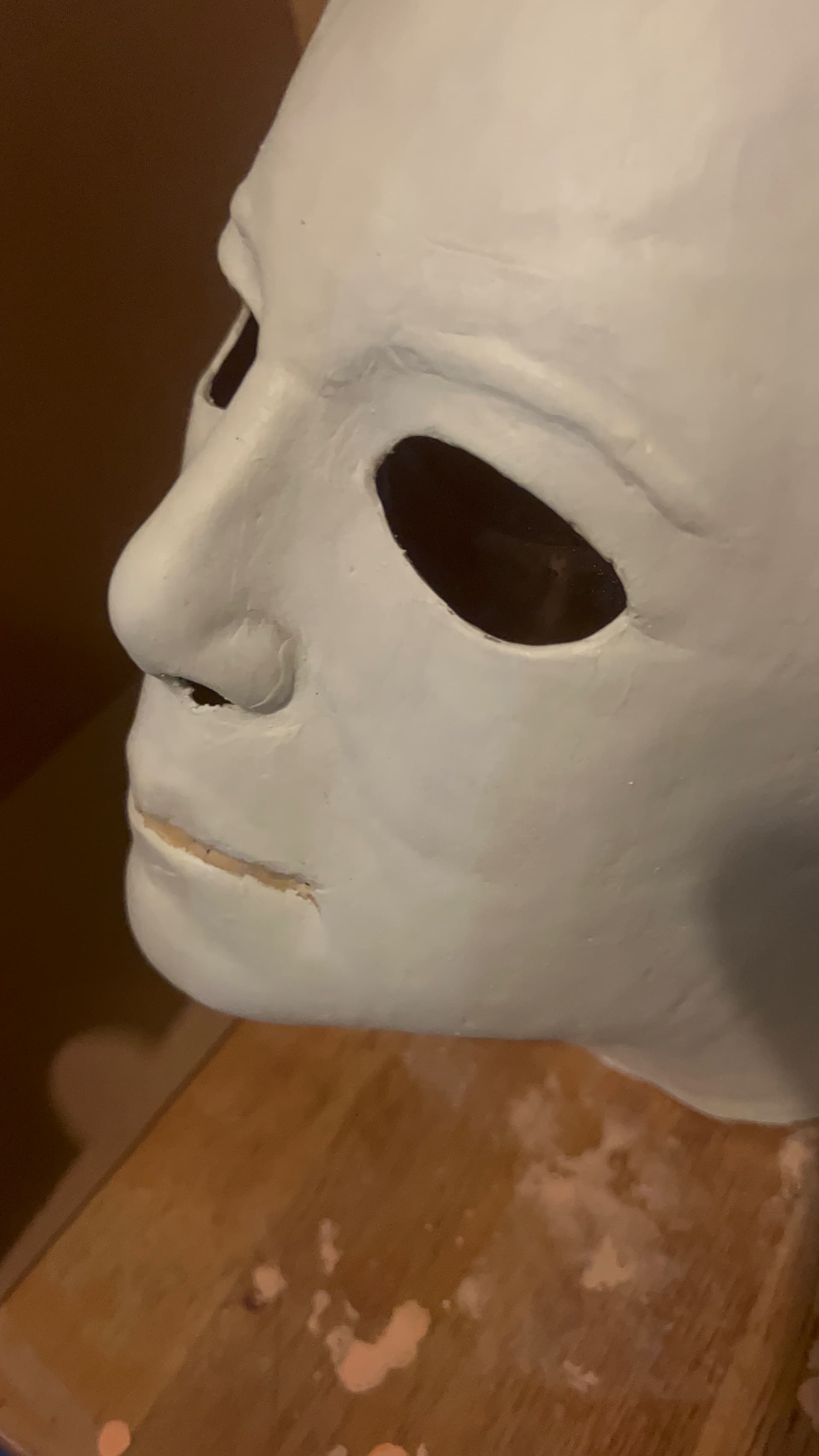 Day 2 of paint, 11/7/25. 1 coat. Entire mask is “chalky/ashy” but the paint is smooth and even. The top of the head cracks slightly when mask is manipulated.