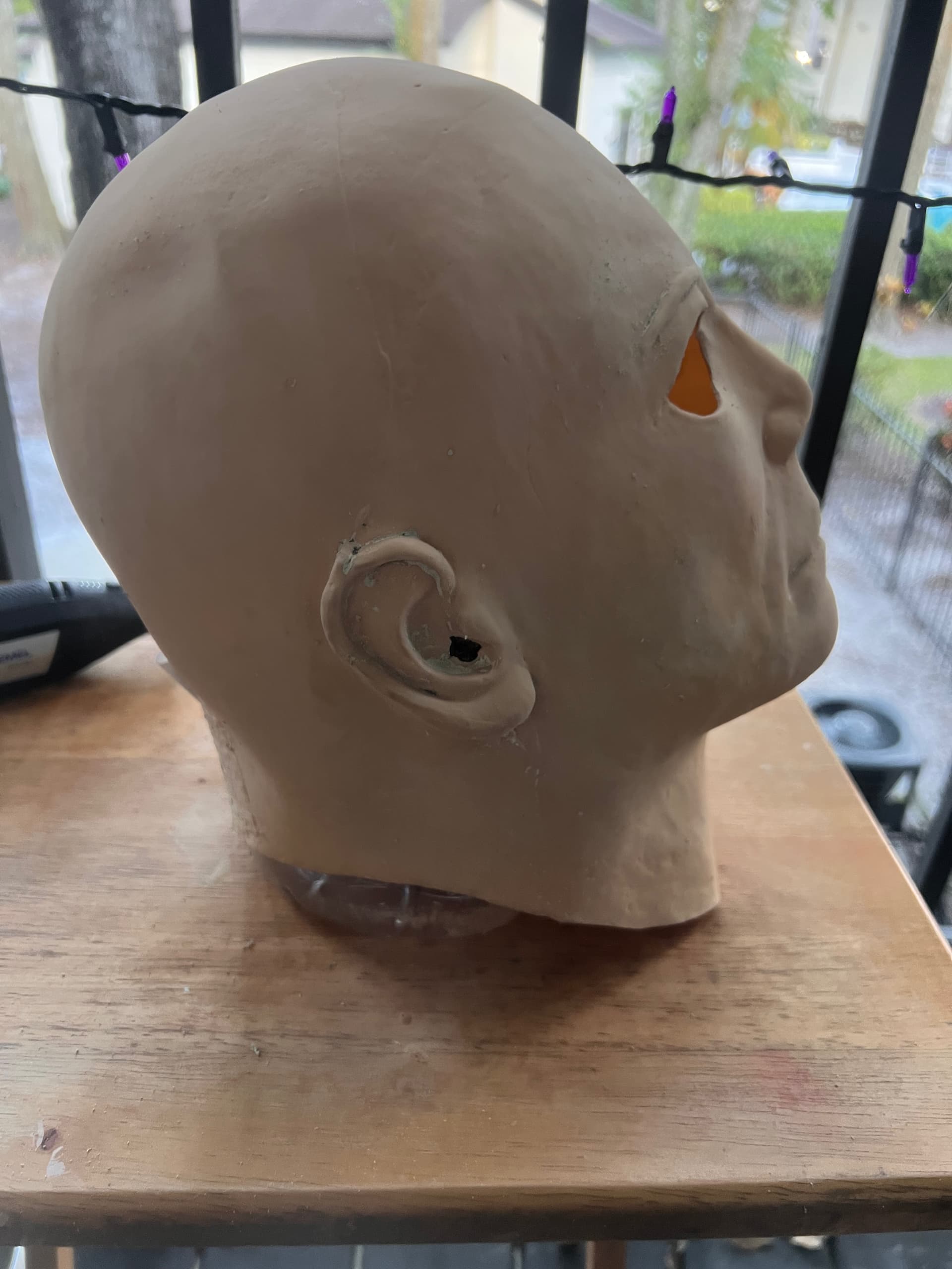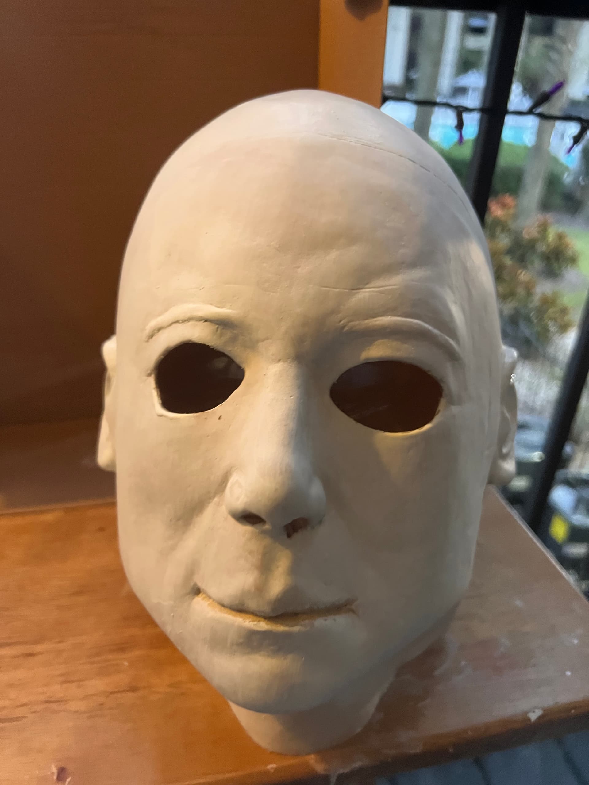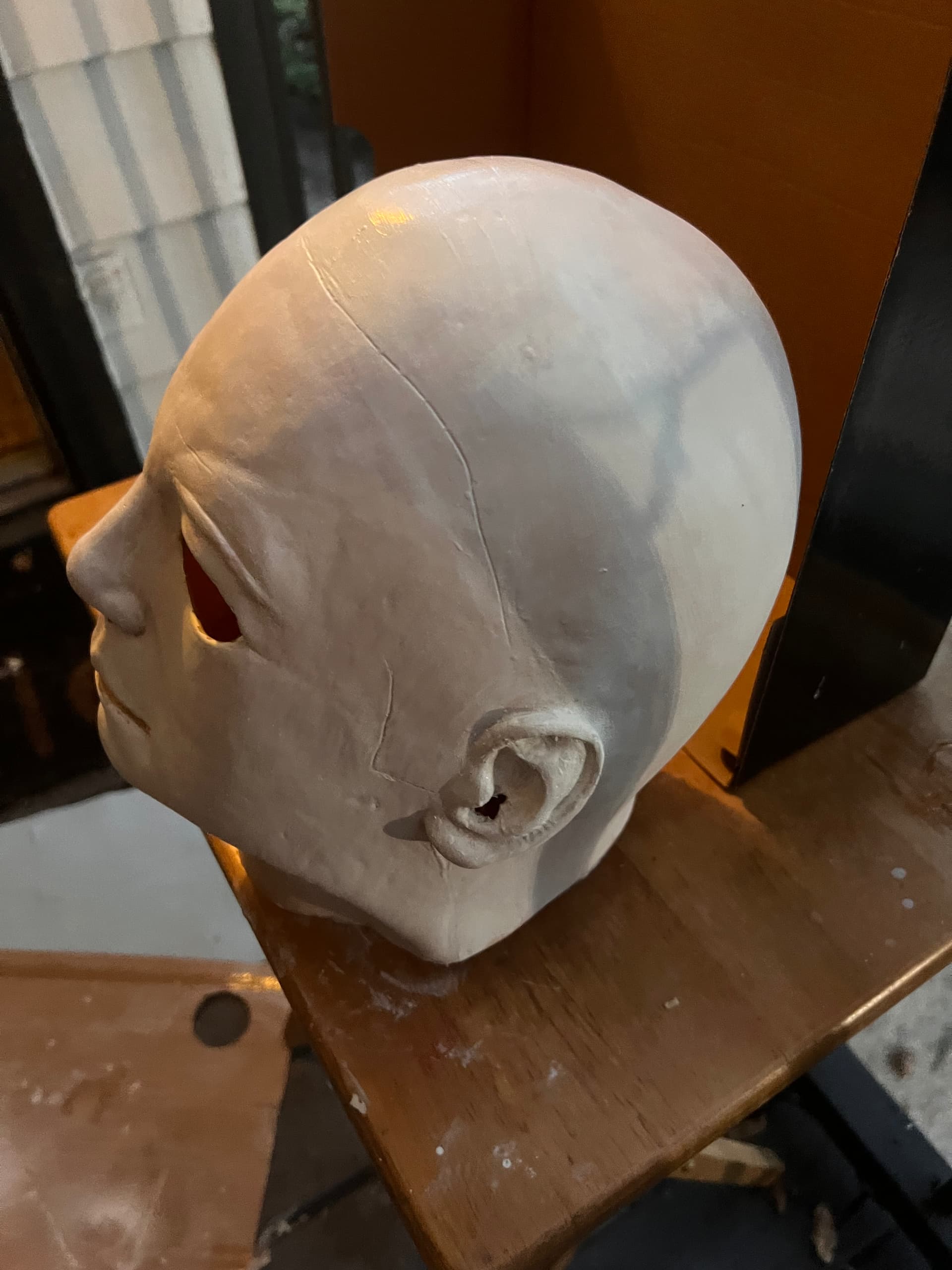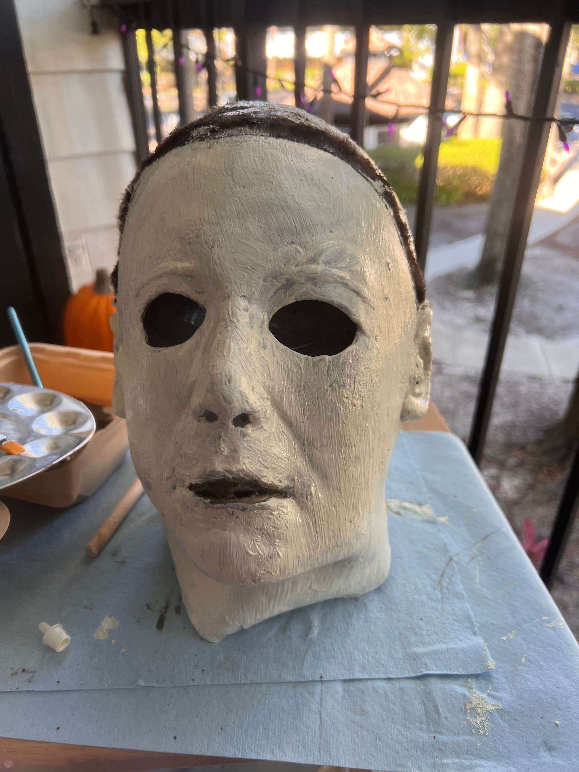 Day 2 of paint, 11/7/25. 1 coat. Entire mask is “chalky/ashy” but the paint is smooth and even. The top of the head cracks slightly when mask is manipulated.