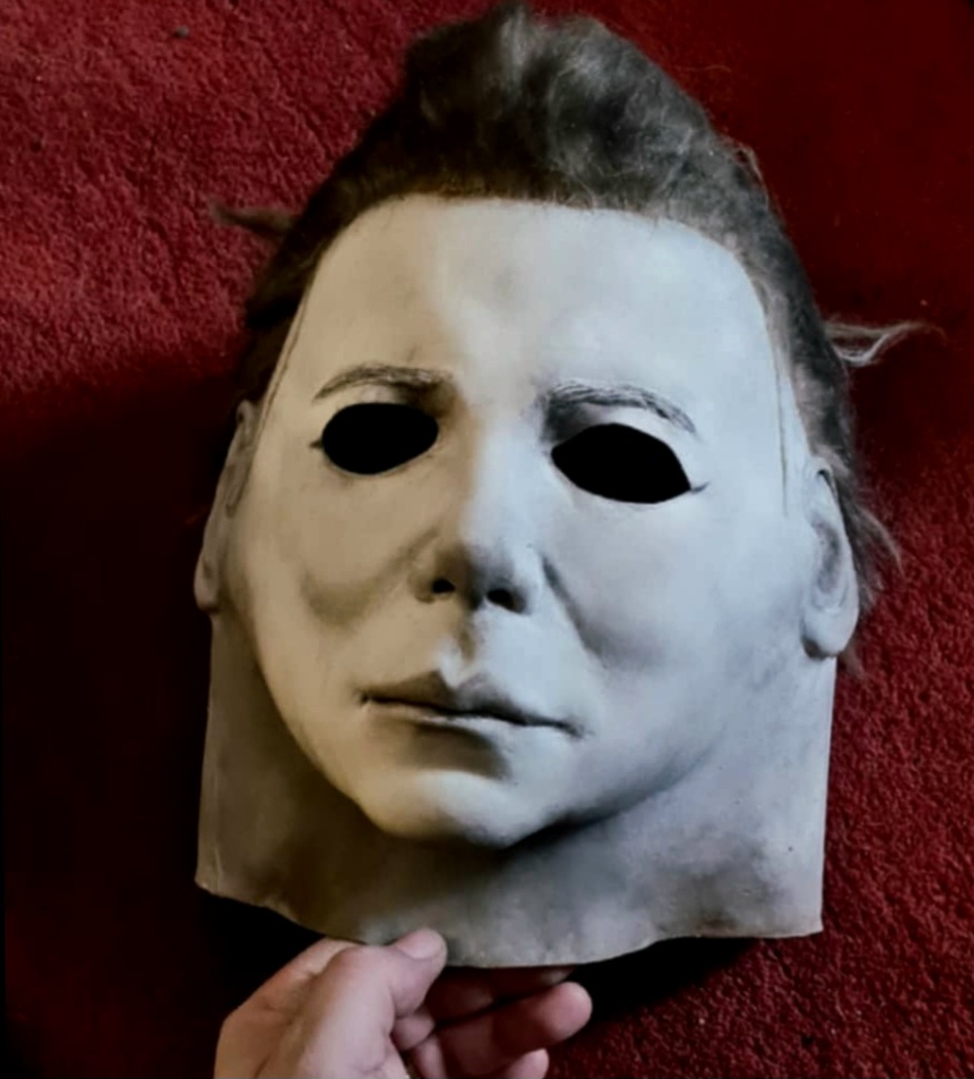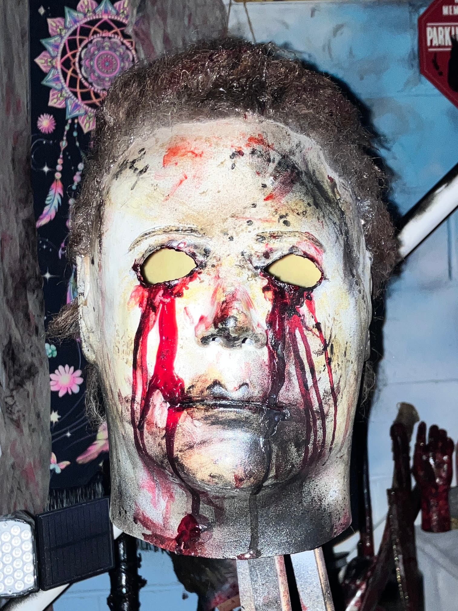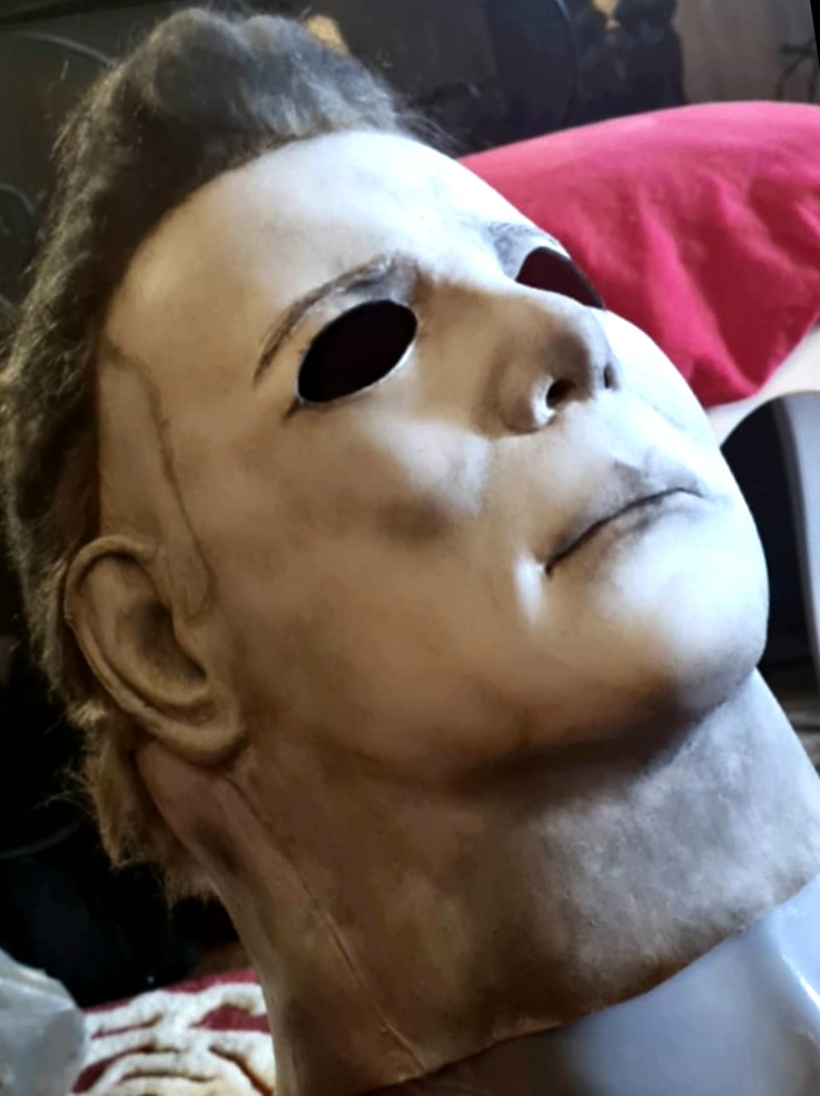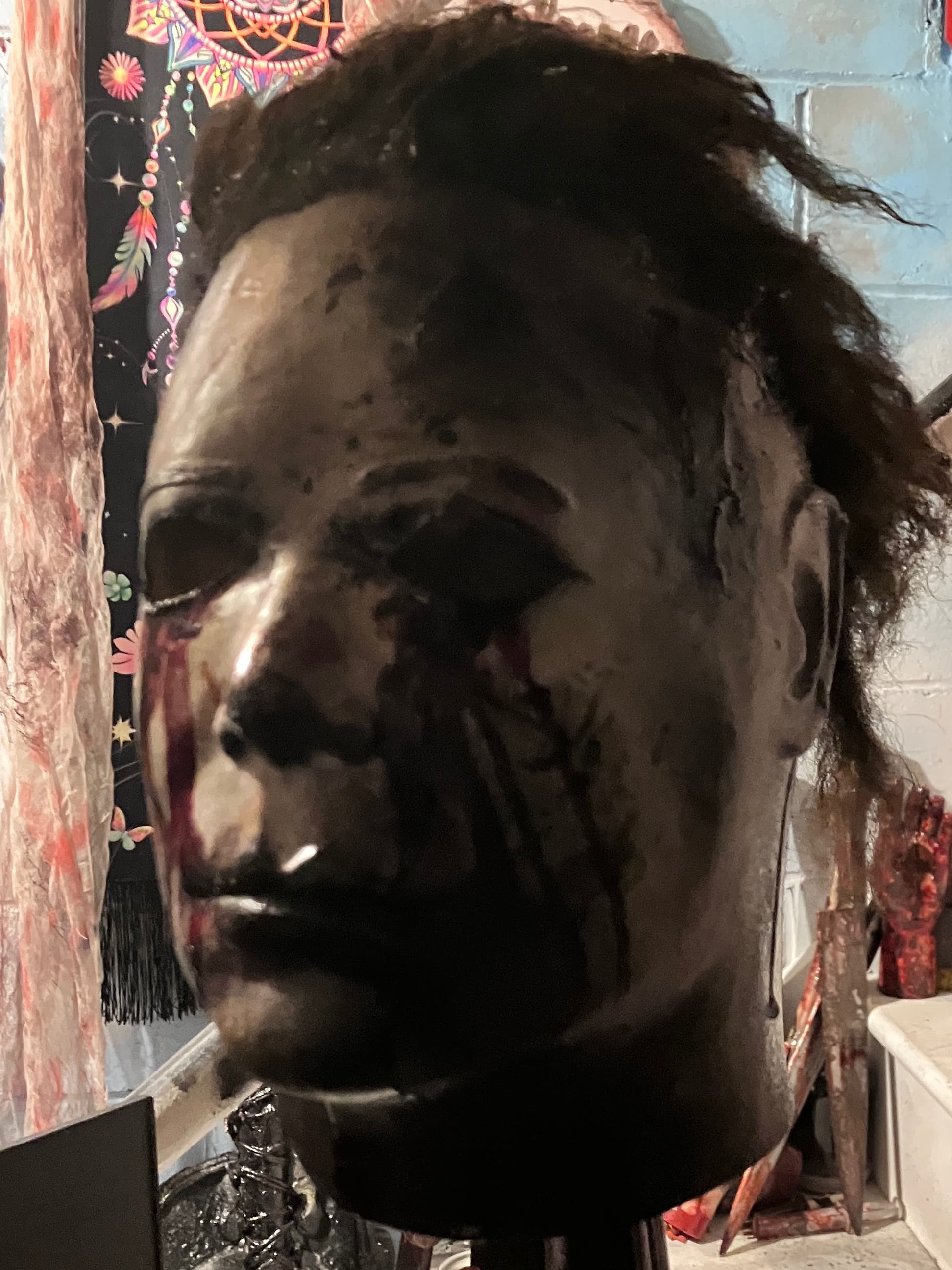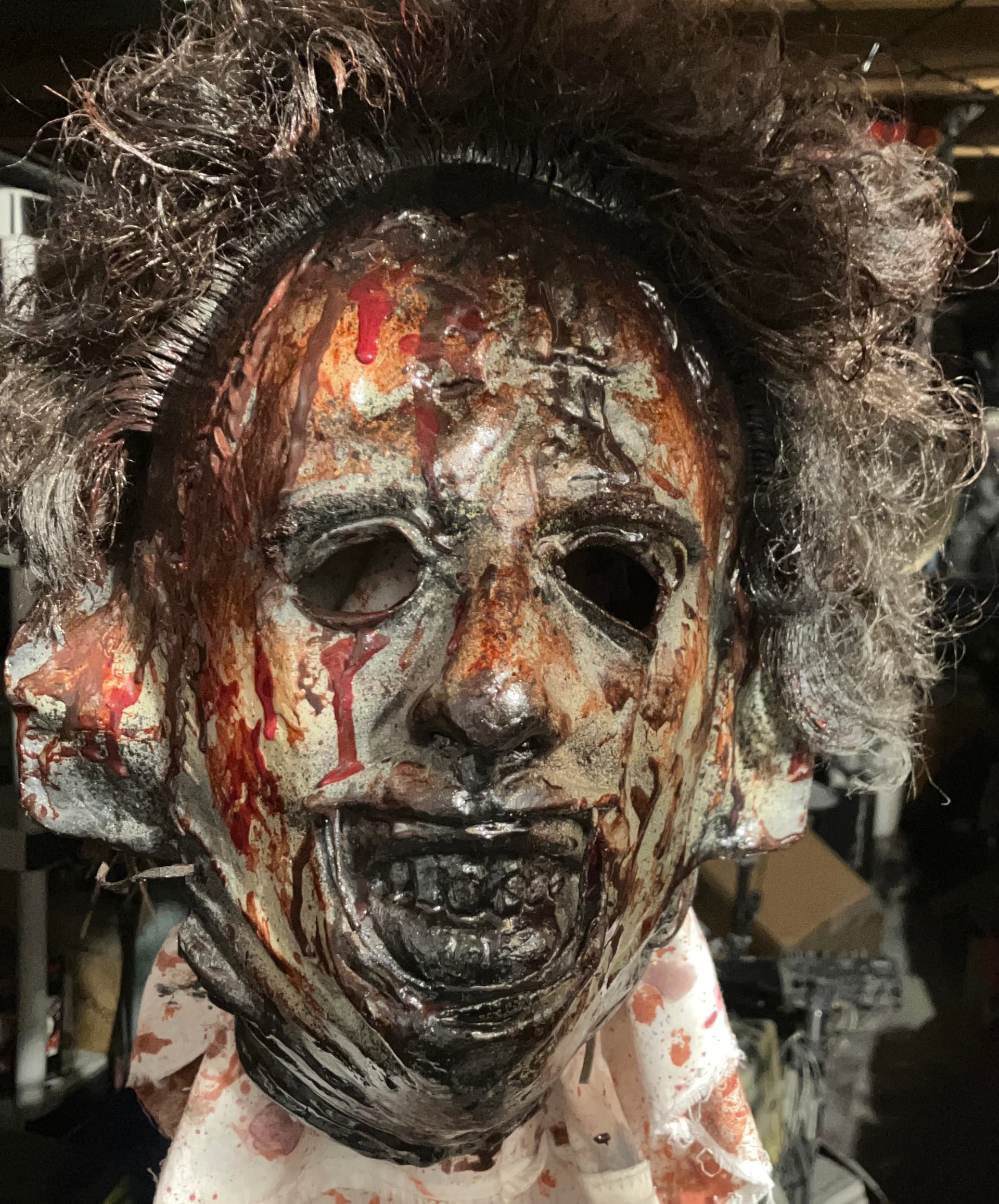 Me—I did everything from paint, blood, eye cuts, and hair on this mask I bought long ago. I finished it this morning, added final touches, and photographed it.