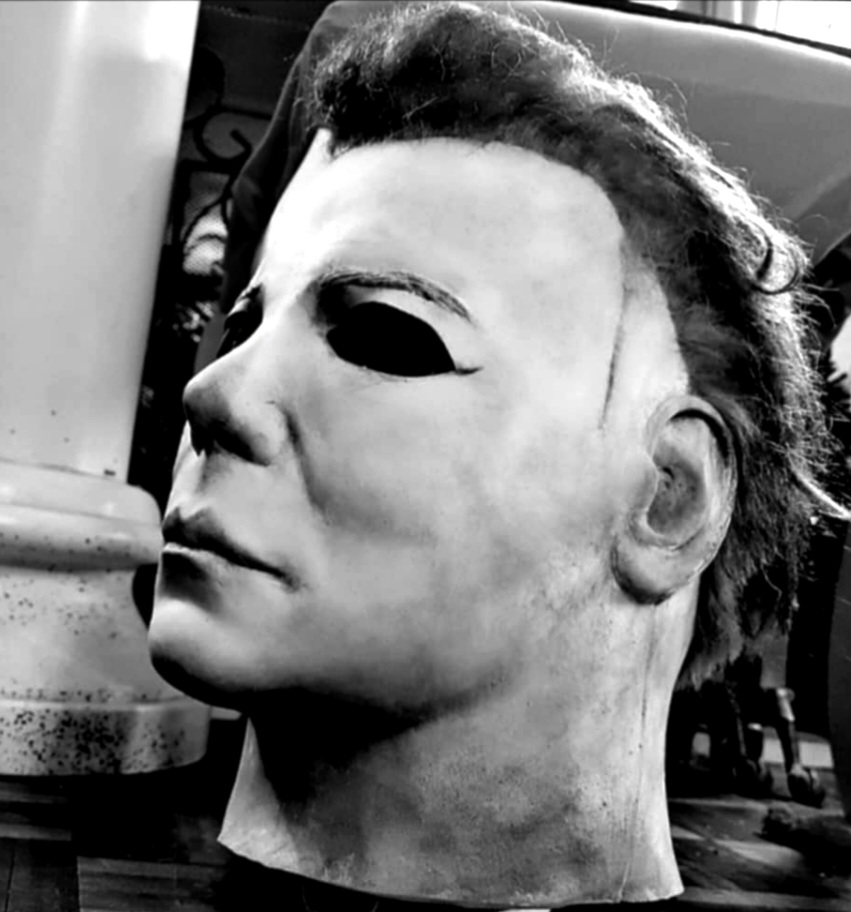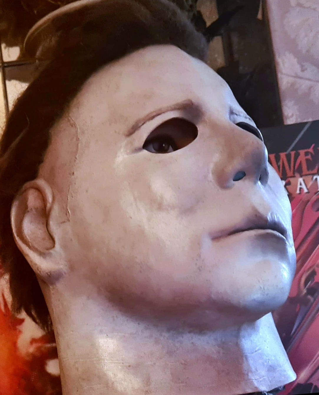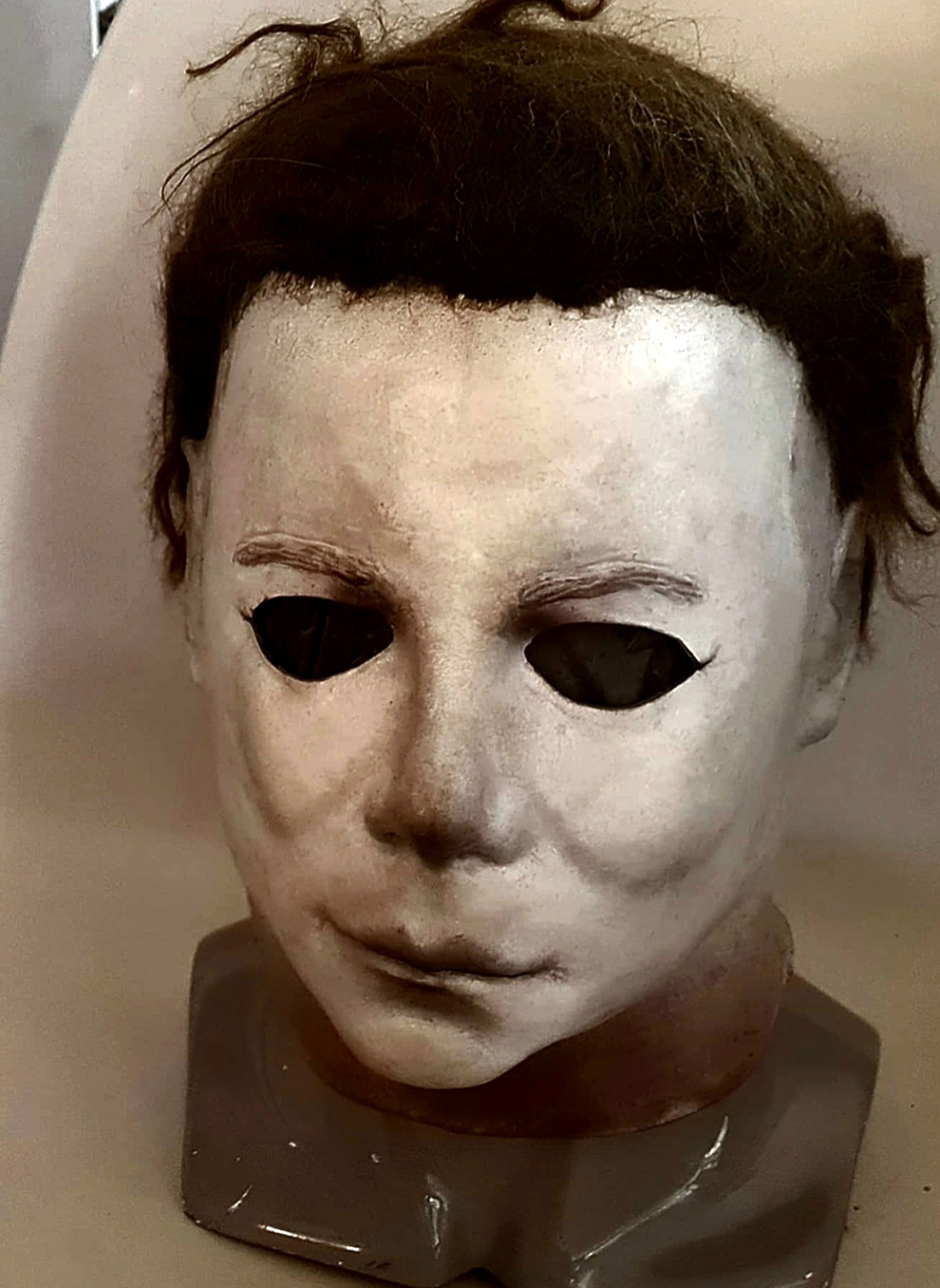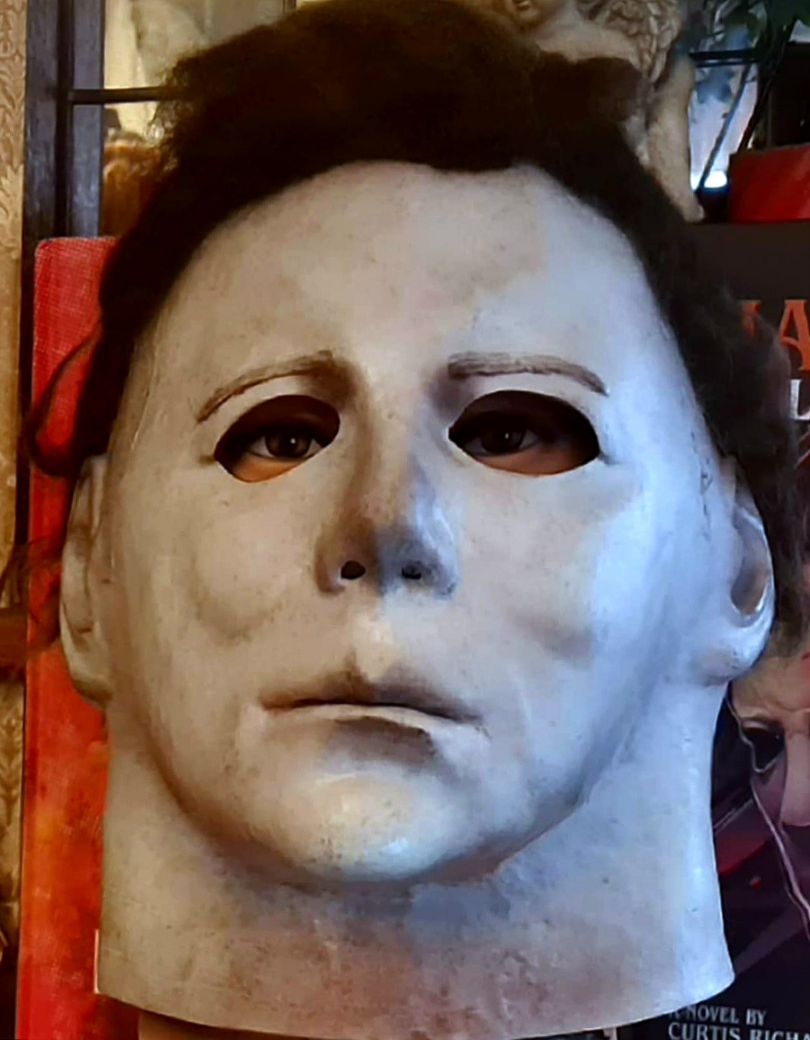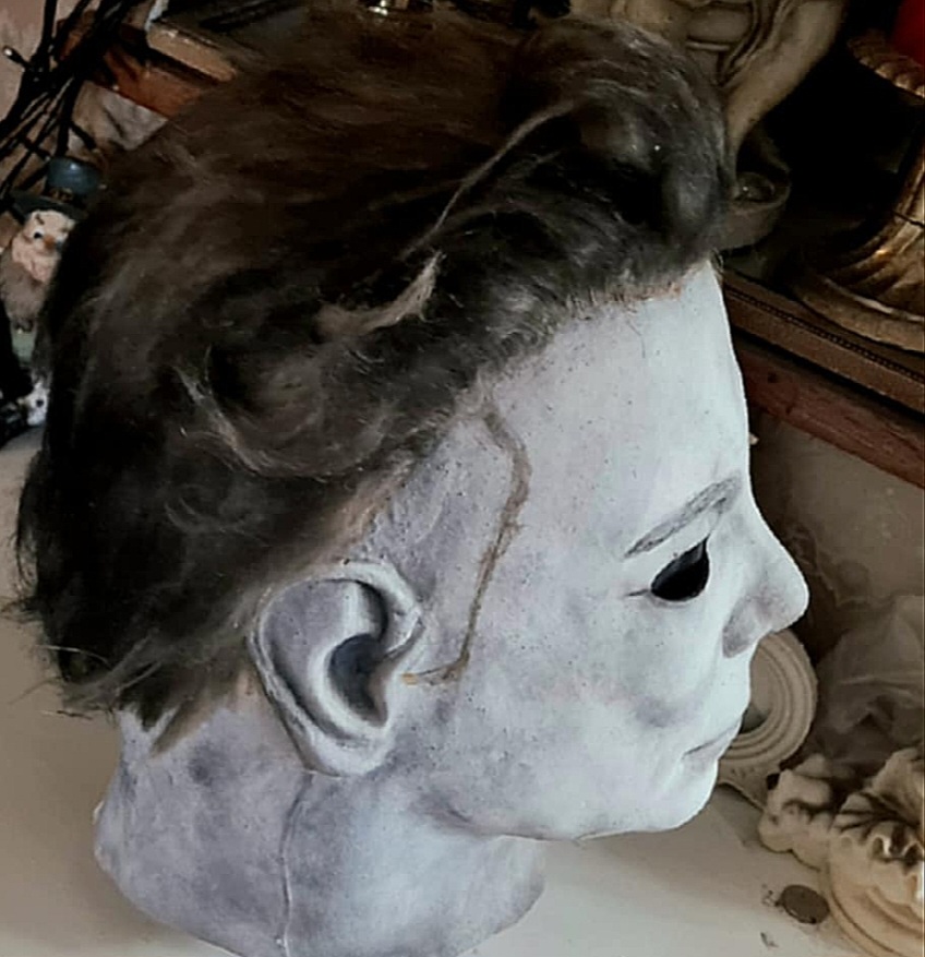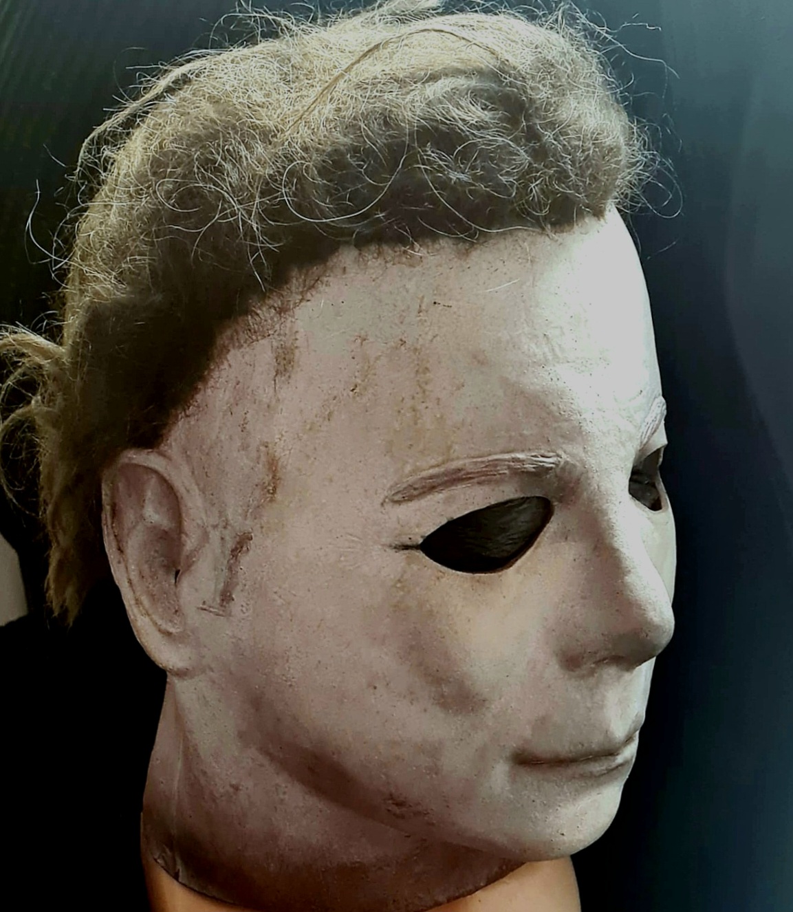 Me—I did everything from paint, blood, eye cuts, and hair on this mask I bought long ago. I finished it this morning, added final touches, and photographed it.