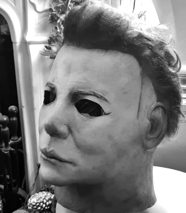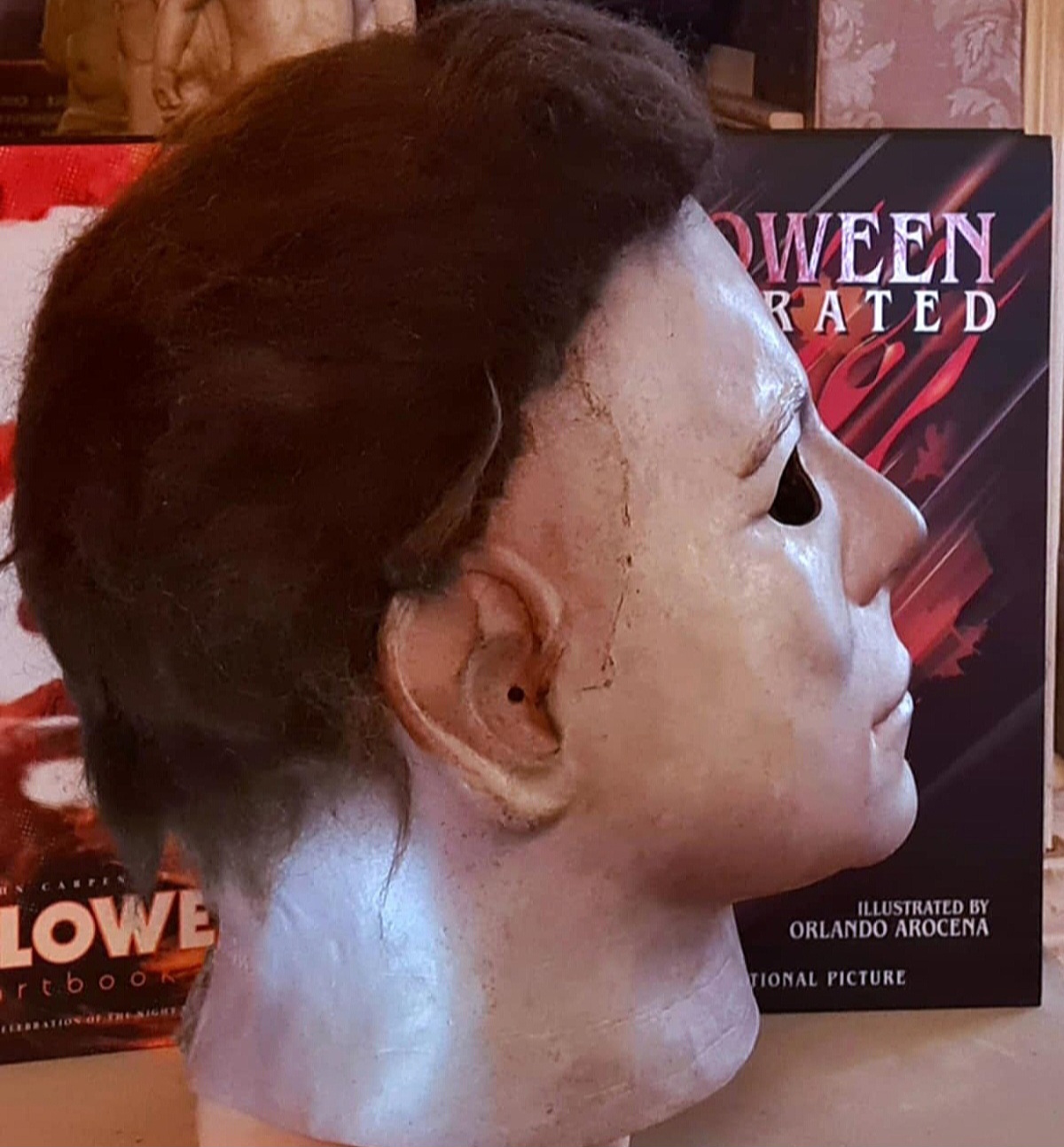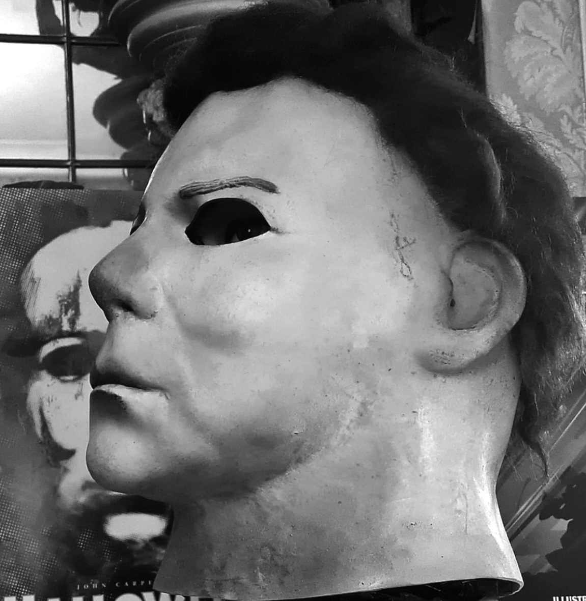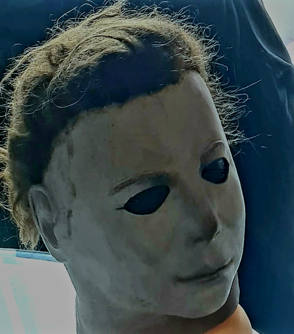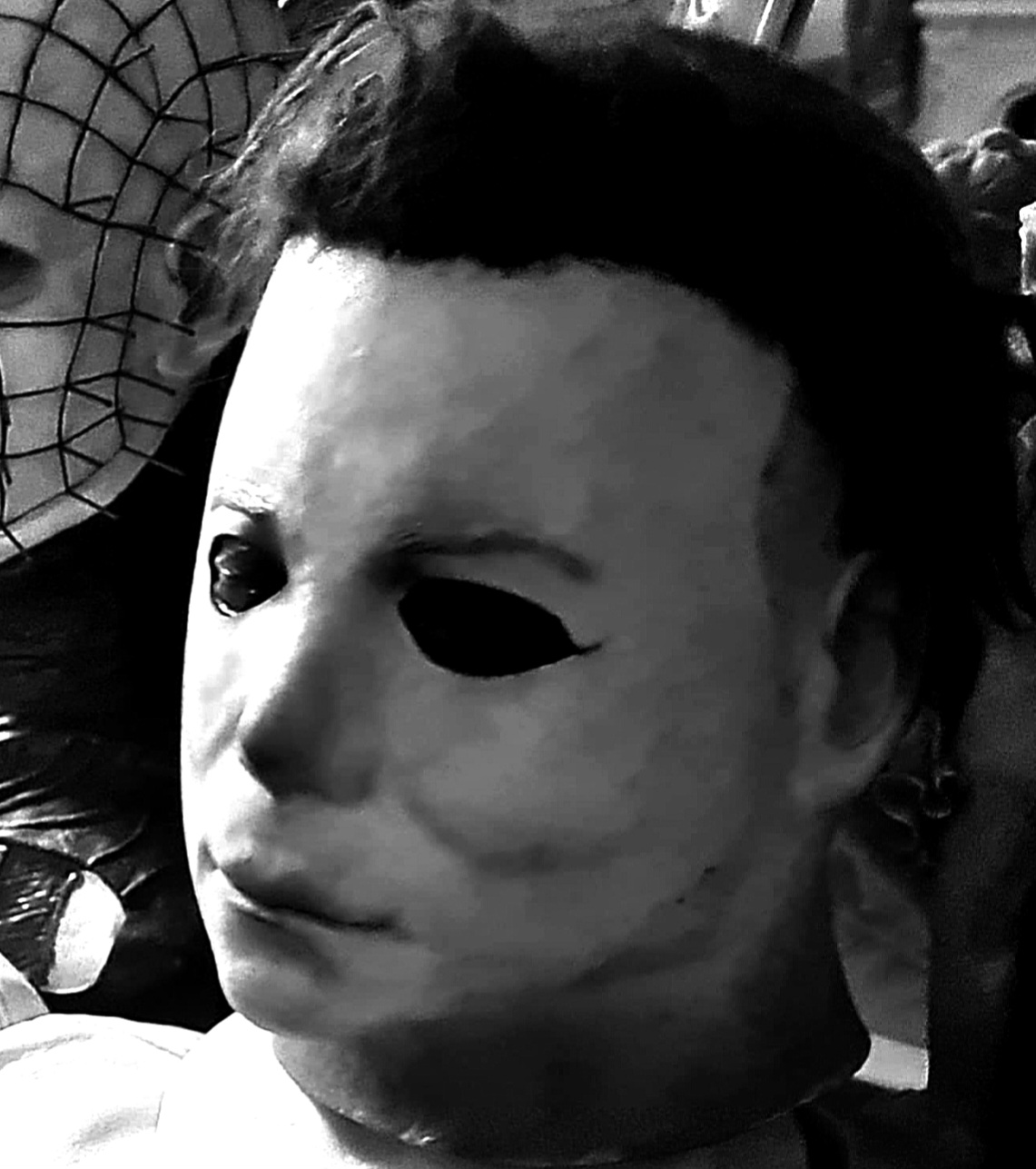 Me—I did everything from paint, blood, eye cuts, and hair on this mask I bought long ago. I finished it this morning, added final touches, and photographed it.