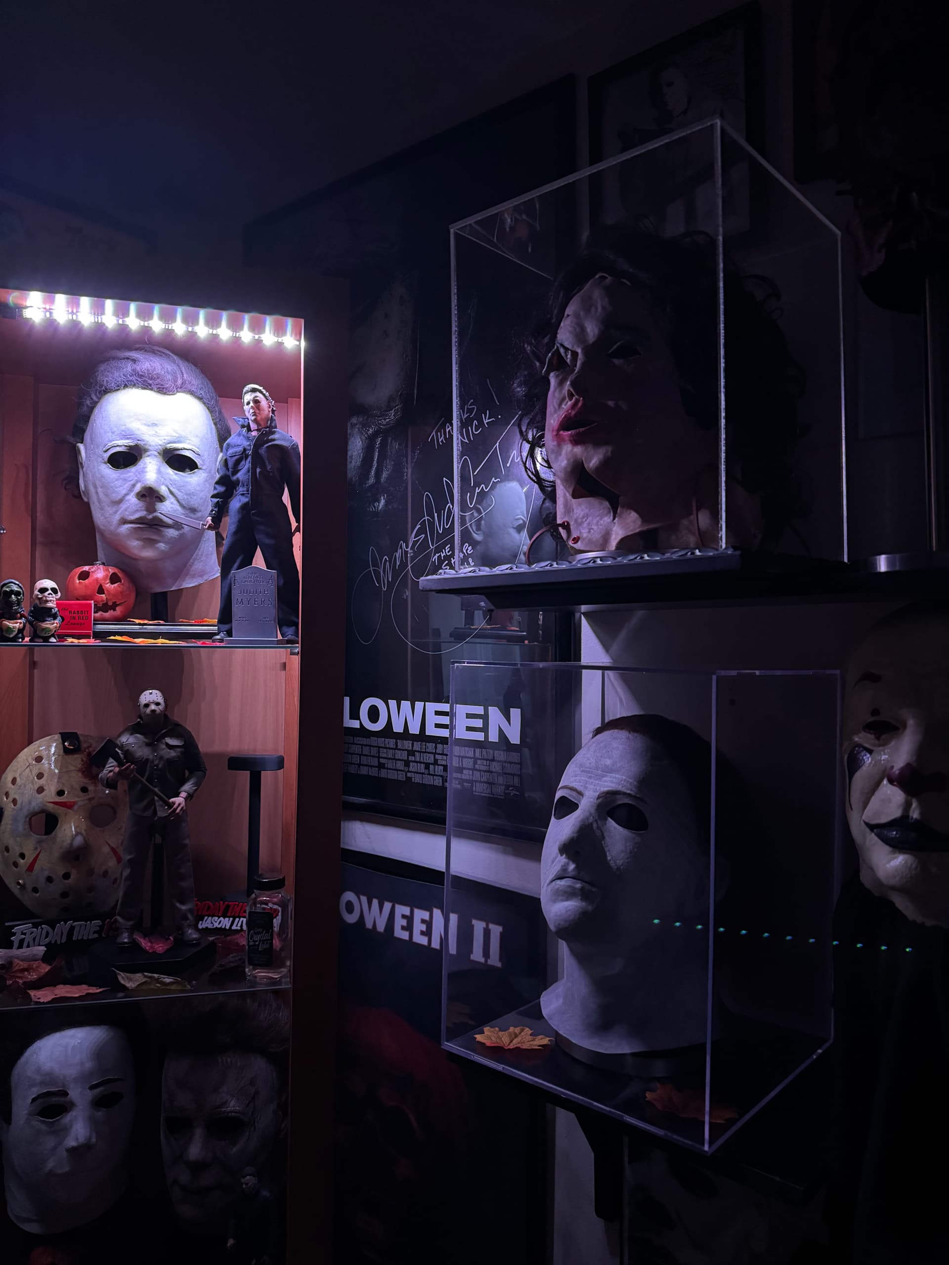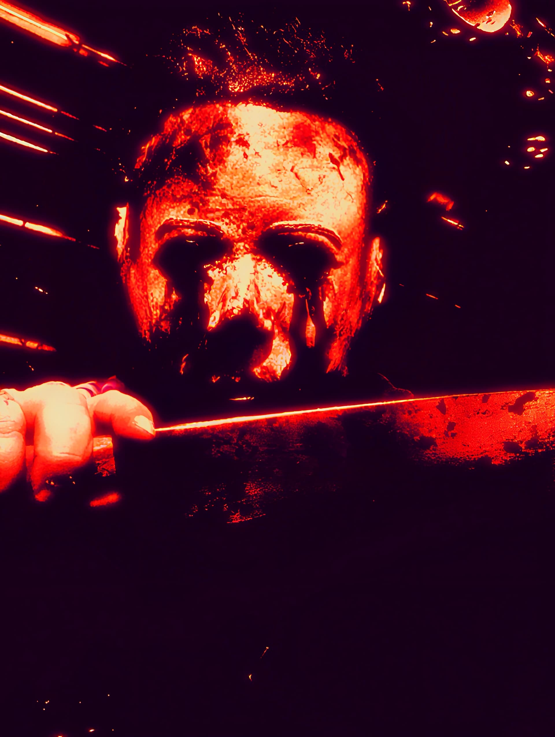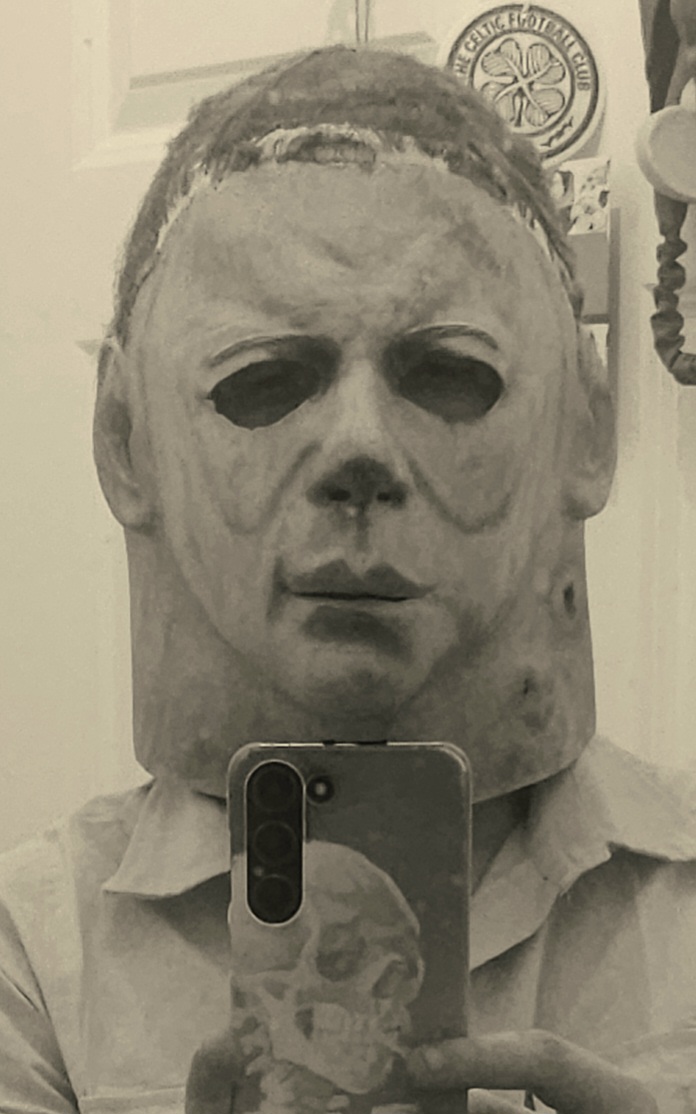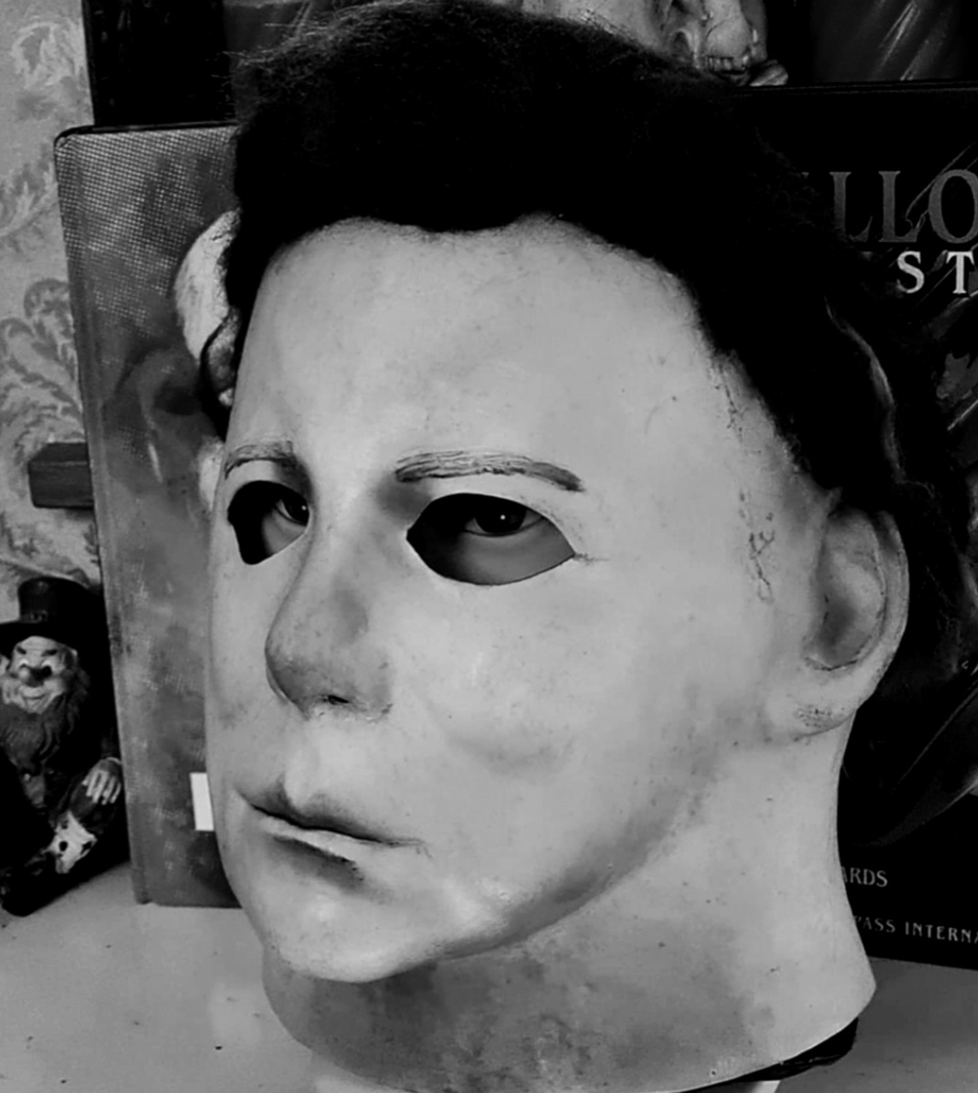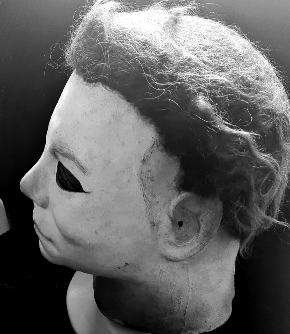 Me—I did everything from paint, blood, eye cuts, and hair on this mask I bought long ago. I finished it this morning, added final touches, and photographed it.