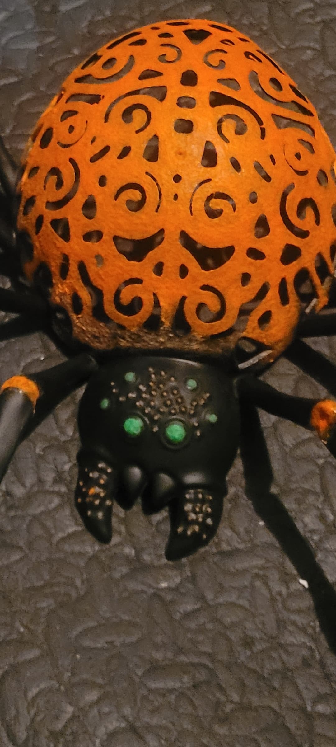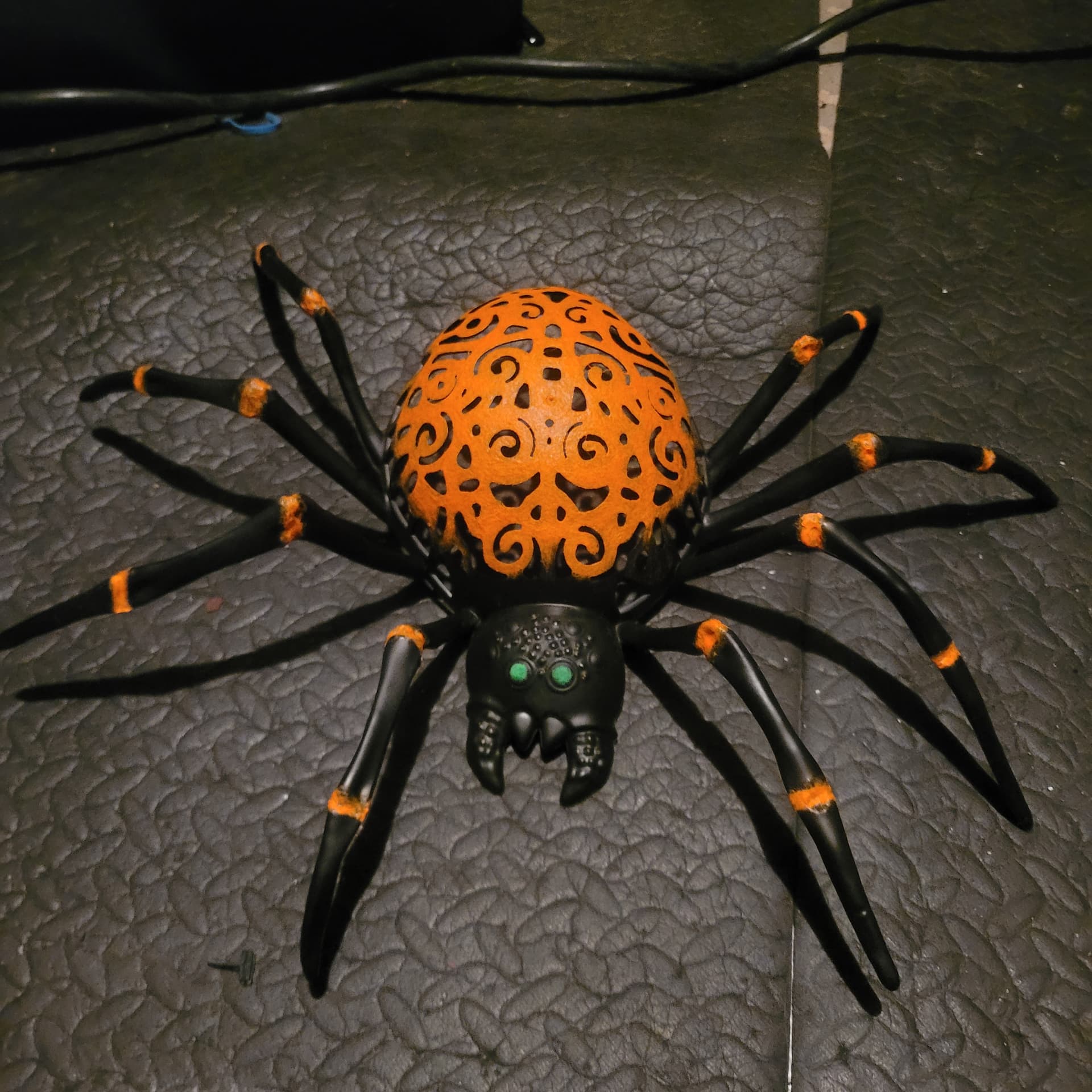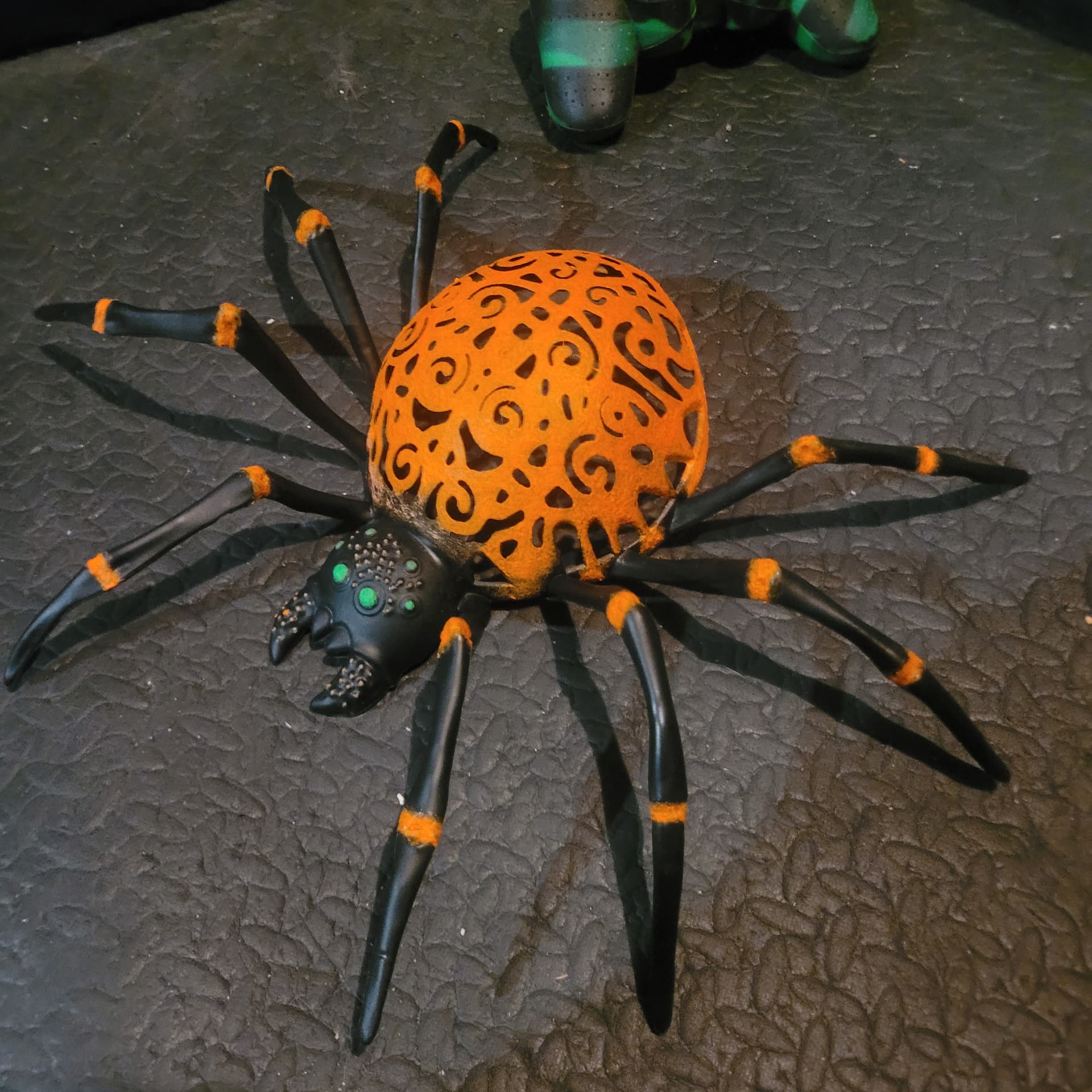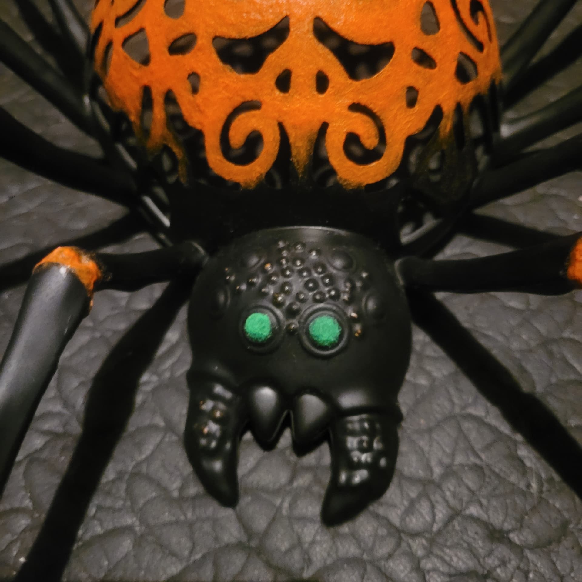 Revamping this spider with glow in the dark paint. Sorry, photos out of order it was just all black to begin with. The face should be fun, lots of tiny little circles. Coming along nicely though, it takes like 6 passes to get the right colour saturation with paint and pigment.
