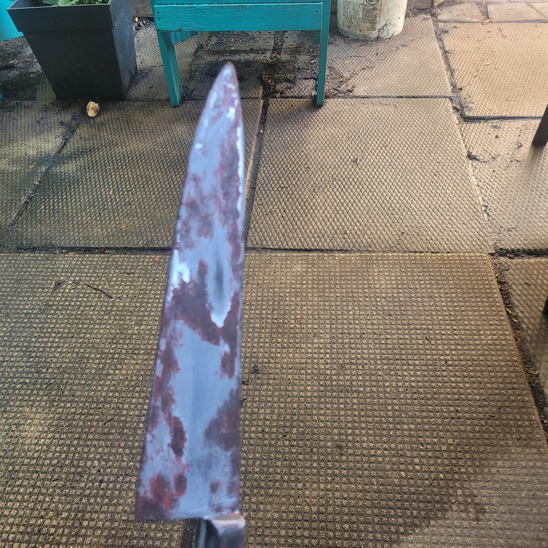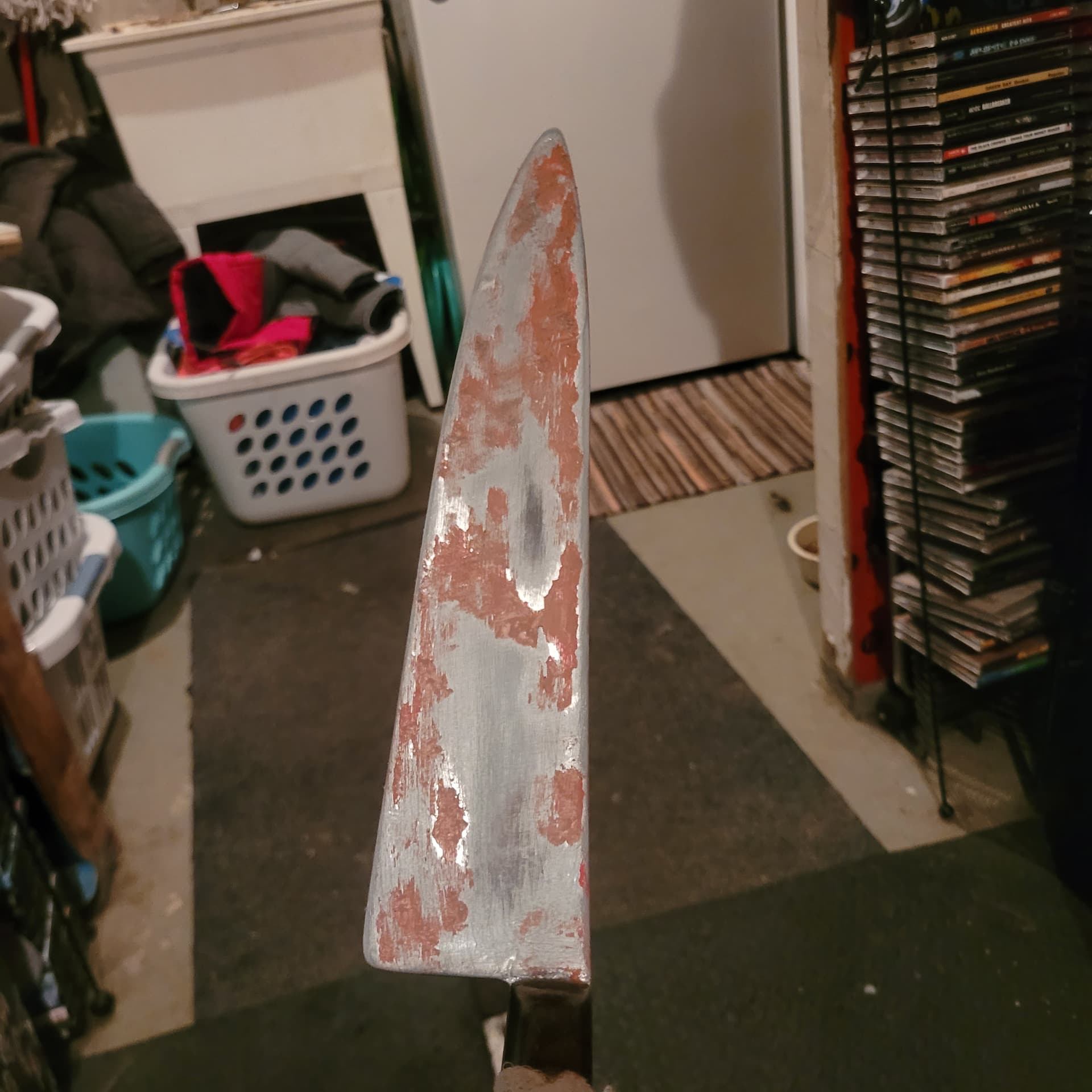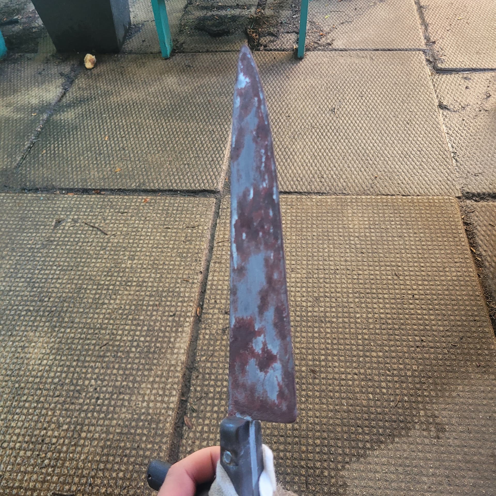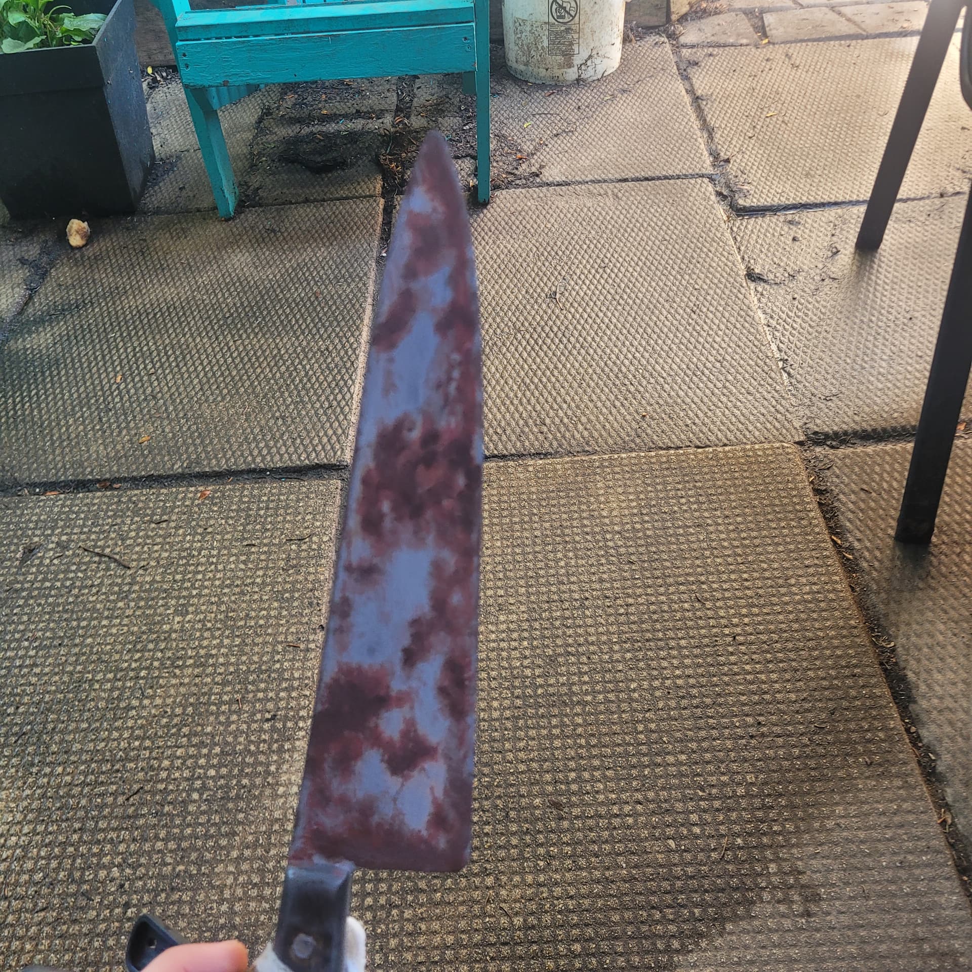 So ive started rusting the Ends knife gunna go out today and get some more spray paint (this is just acrylic for rust, the nozzle on my red oxide spray paint broke , it will be more brown than red oxide but i feel the redoxide is a good base) Kinda want a second opinion , should i do the rust fx then spray over with metallic paint and sand it down again ? Doing some splatter fx on the bucket too.