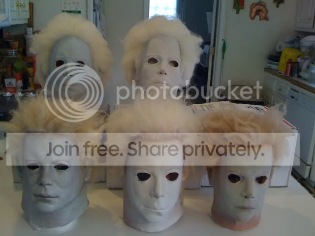 Went down stairs and asked Rob Tharp how many Myers masks HE made for the movie. Rob recalls three Myers masks and two Ben Tramer (light blue with blond hair) masks produced.
