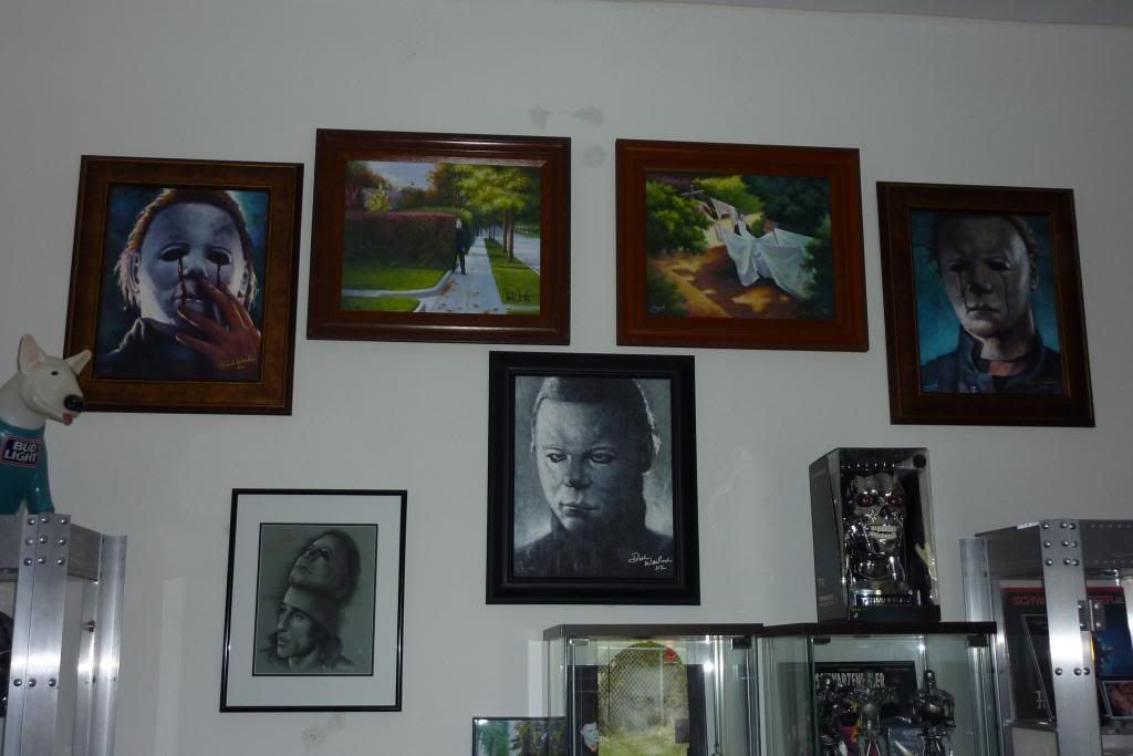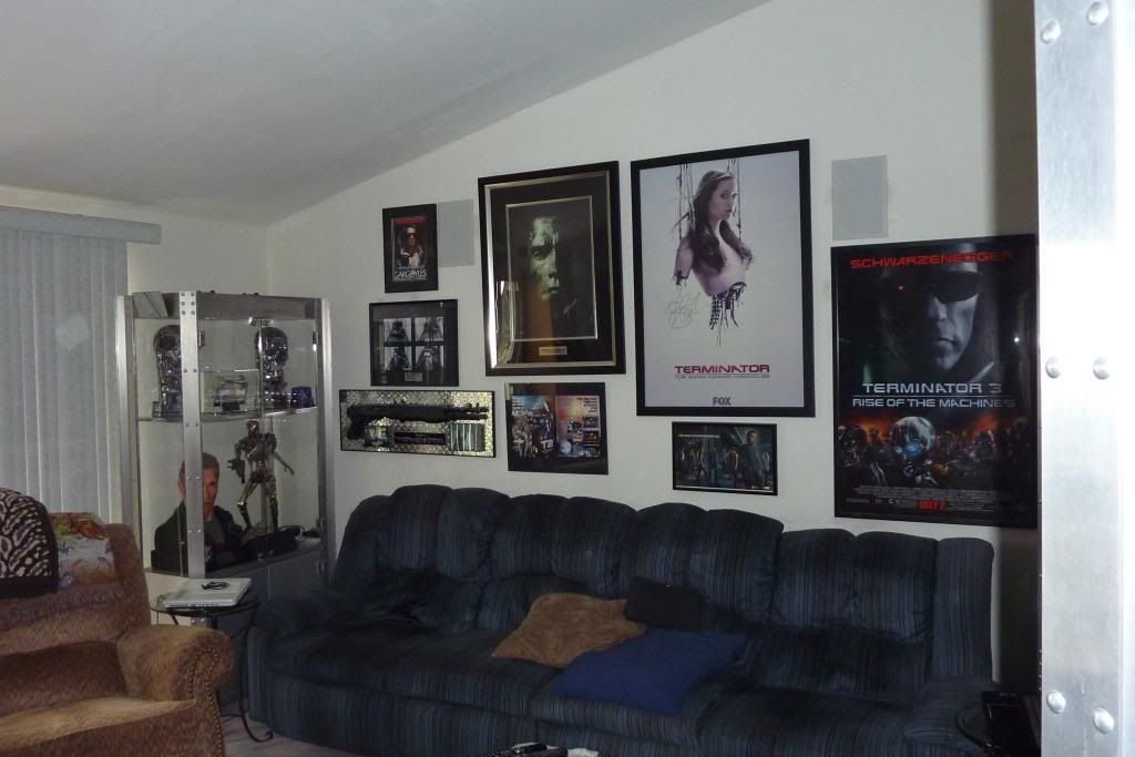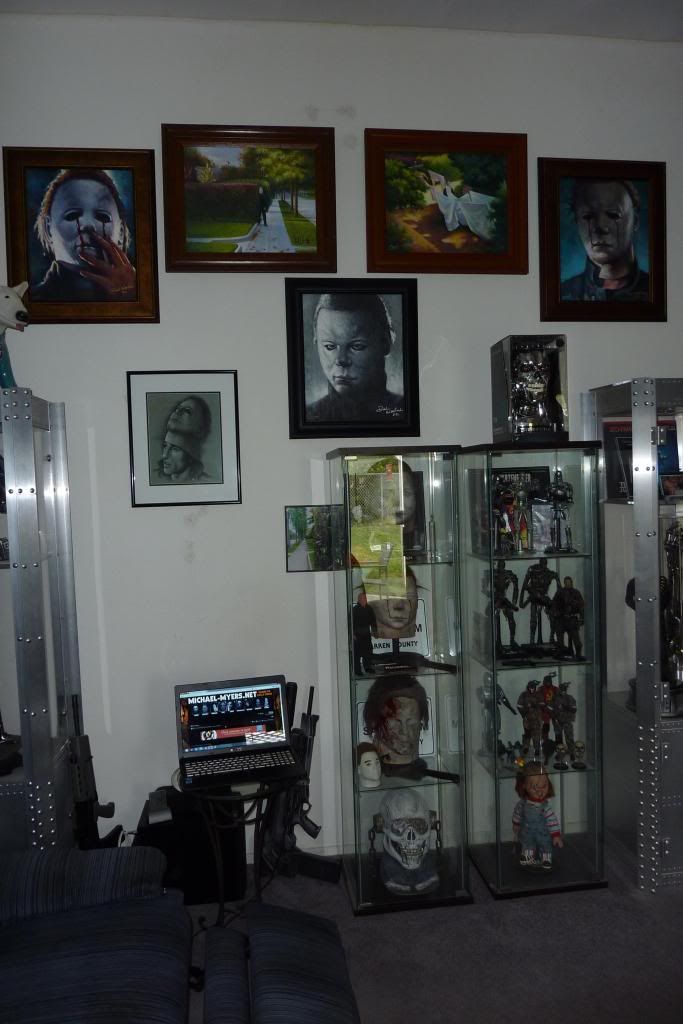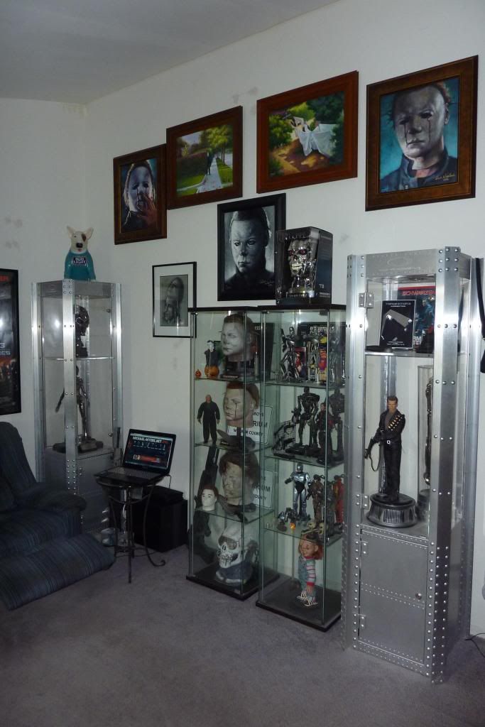 Just wanted to share my LIVING ROOM / THEATER ROOM with you guys. MYERS ARTMARK WALL and DETOLFS with my MYERS MASKS and other various collectibles. The OAKLEY cabinets contain my TERMINATOR COLLECTIBLES. Also my TELEVISION and BLURAY collection. Hope you like what you see. Thanks for looking and welcome to my LIVING ROOM Mike
