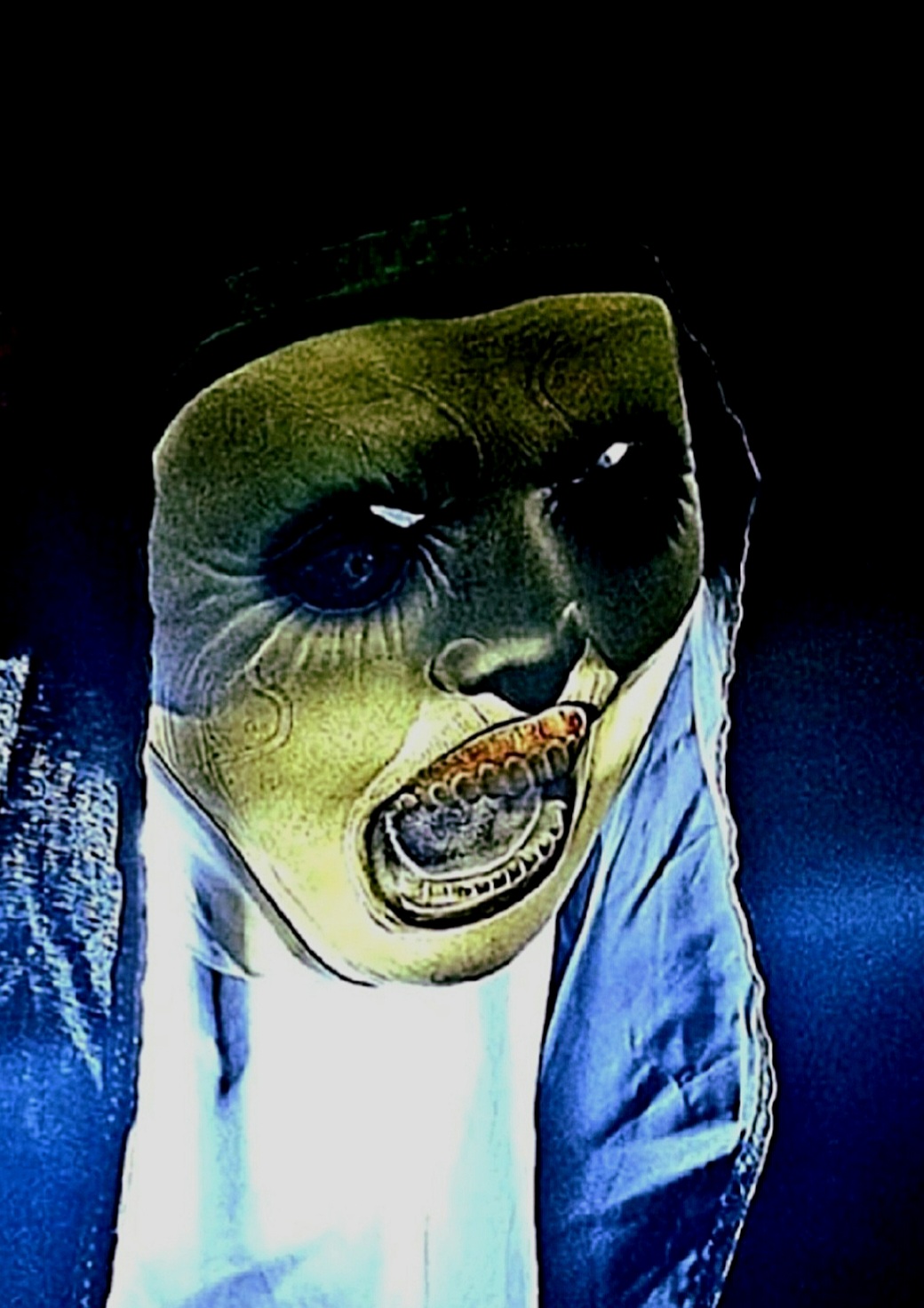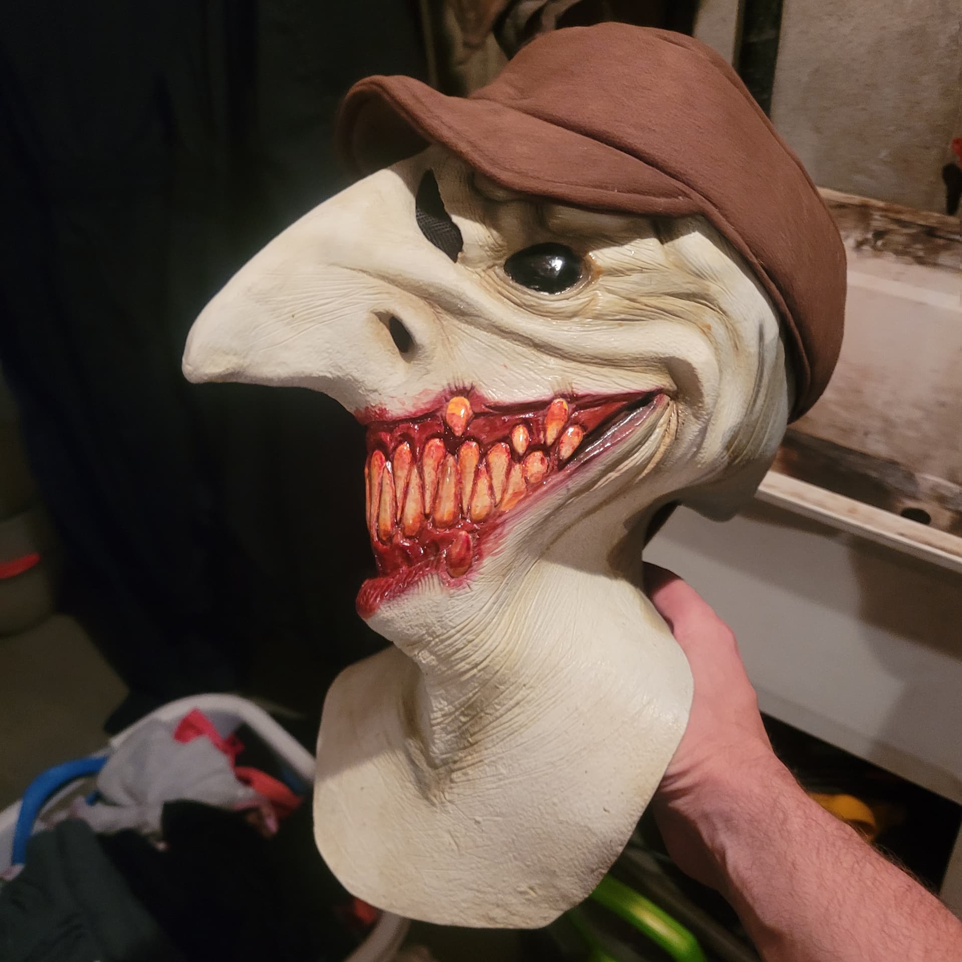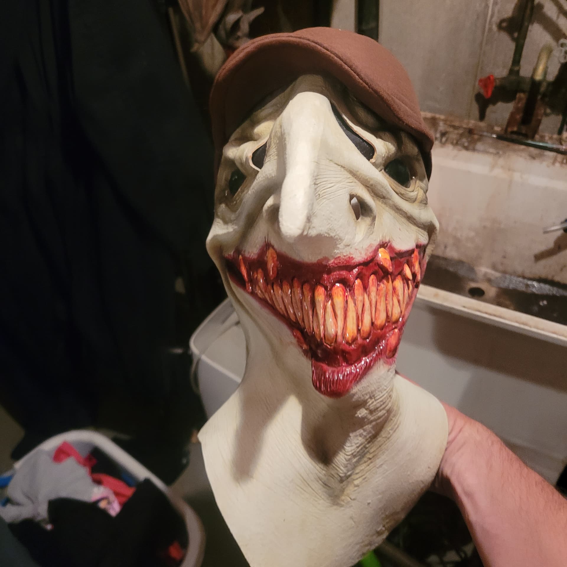 Have to get better lighting but this mask was a steal for 56 bucks . I call him Sharky the Pool Shark and had a brown trenchcoat, white monster hands and a broken bloody pool cue. Have to really dig to find the photos of when i dressed up , it was years ago, but def creeped people out. Pretty unique IMO.