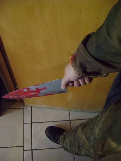 The knife is scratchbuilt by me and will eventually swap it for a Forschner 19 incher like the ones used in the movie.